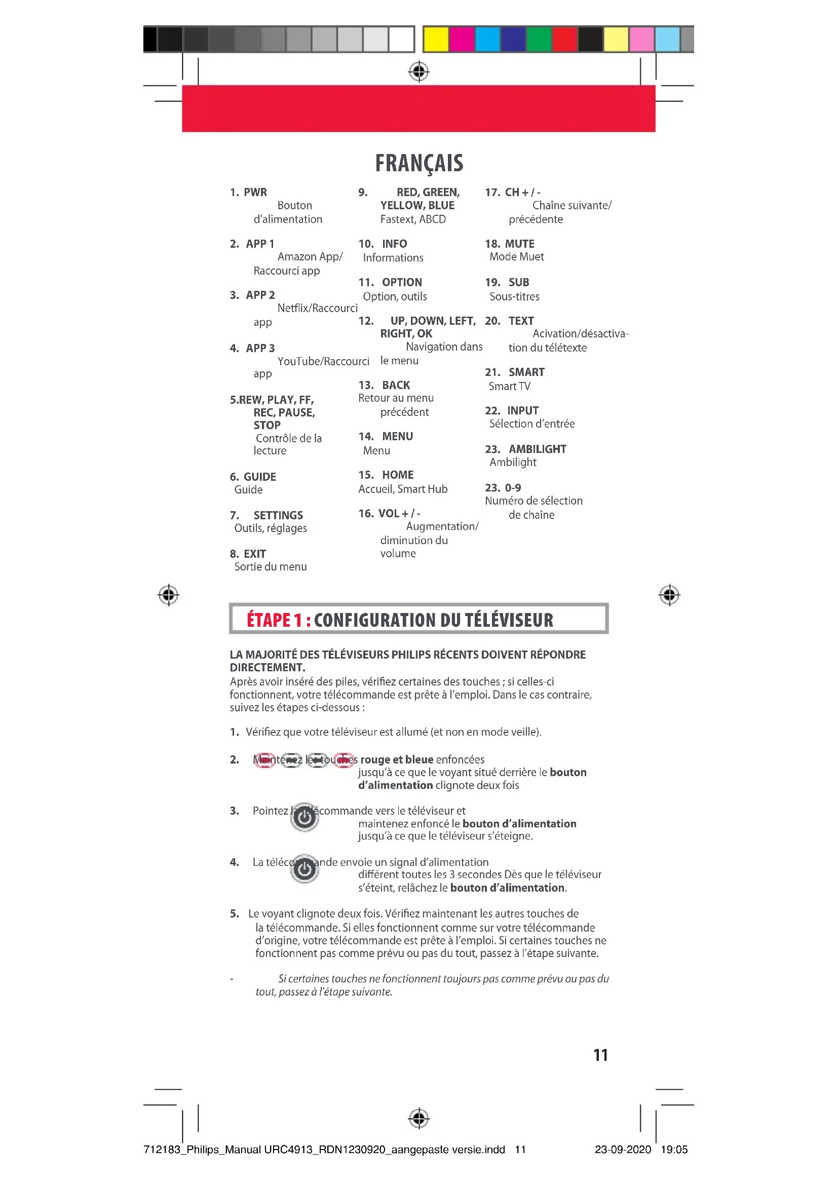 DEUTSCH 712183_Philips_Manual URC4913_RDN1230920_aangepaste versie.indd 10712183_Philips_Manual URC4913_RDN1230920_aangepaste versie.indd 10 23-09-2020 19:0523-09-2020 19:0511 FRANÇAIS LA MAJORITÉ DES TÉLÉVISEURS PHILIPS RÉCENTS DOIVENT RÉPONDRE DIRECTEMENT. Après avoir inséré des piles, vériez certaines des touches; si celles-ci fonctionnent, votre télécommande est prête à l’emploi. Dans le cas contraire, suivez les étapes ci-dessous: