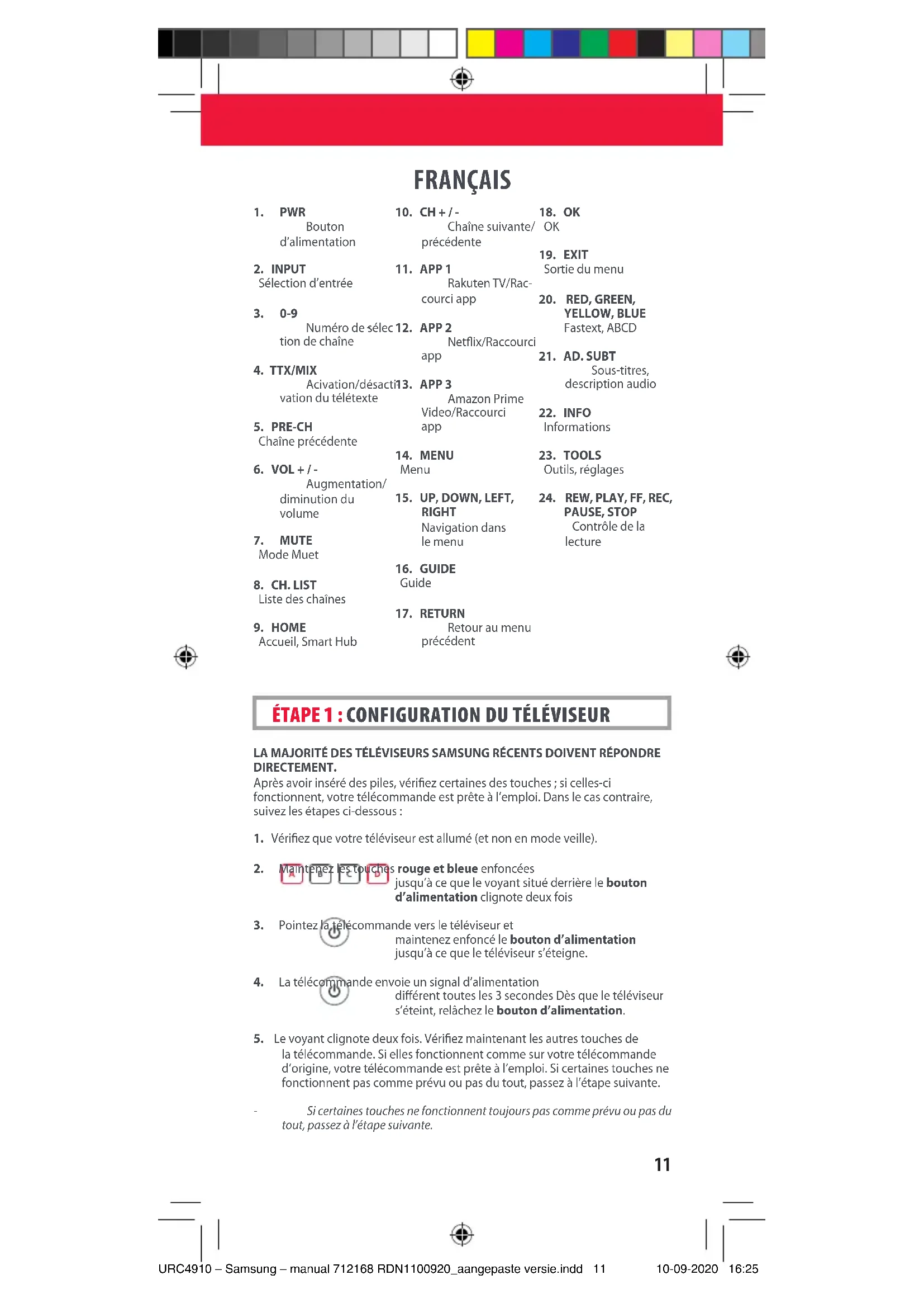 DEUTSCH URC4910 – Samsung – manual 712168 RDN1100920_aangepaste versie.indd 10URC4910 – Samsung – manual 712168 RDN1100920_aangepaste versie.indd 10 10-09-2020 16:2510-09-2020 16:2511 FRANÇAIS LA MAJORITÉ DES TÉLÉVISEURS SAMSUNG RÉCENTS DOIVENT RÉPONDRE DIRECTEMENT. Après avoir inséré des piles, vériez certaines des touches; si celles-ci fonctionnent, votre télécommande est prête à l’emploi. Dans le cas contraire, suivez les étapes ci-dessous: