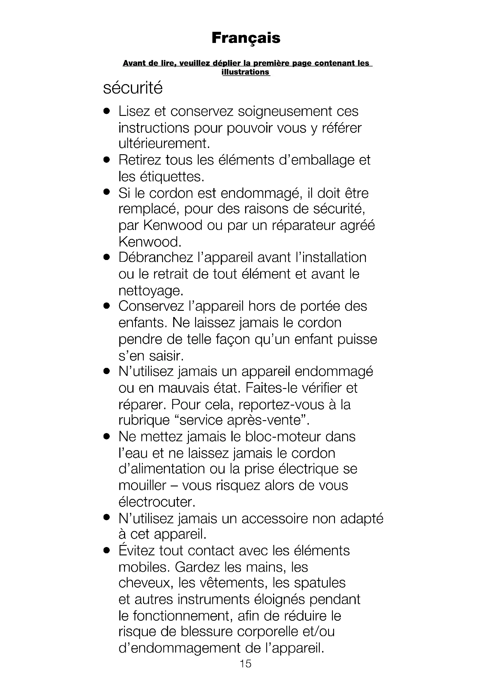 N’employez l’appareil qu’à la fin domestique prévue. Kenwood décline toute responsabilité dans les cas où l’appareil est utilisé incorrectement ou que les présentes instructions ne sont pas respectées. avant de brancher l’appareil