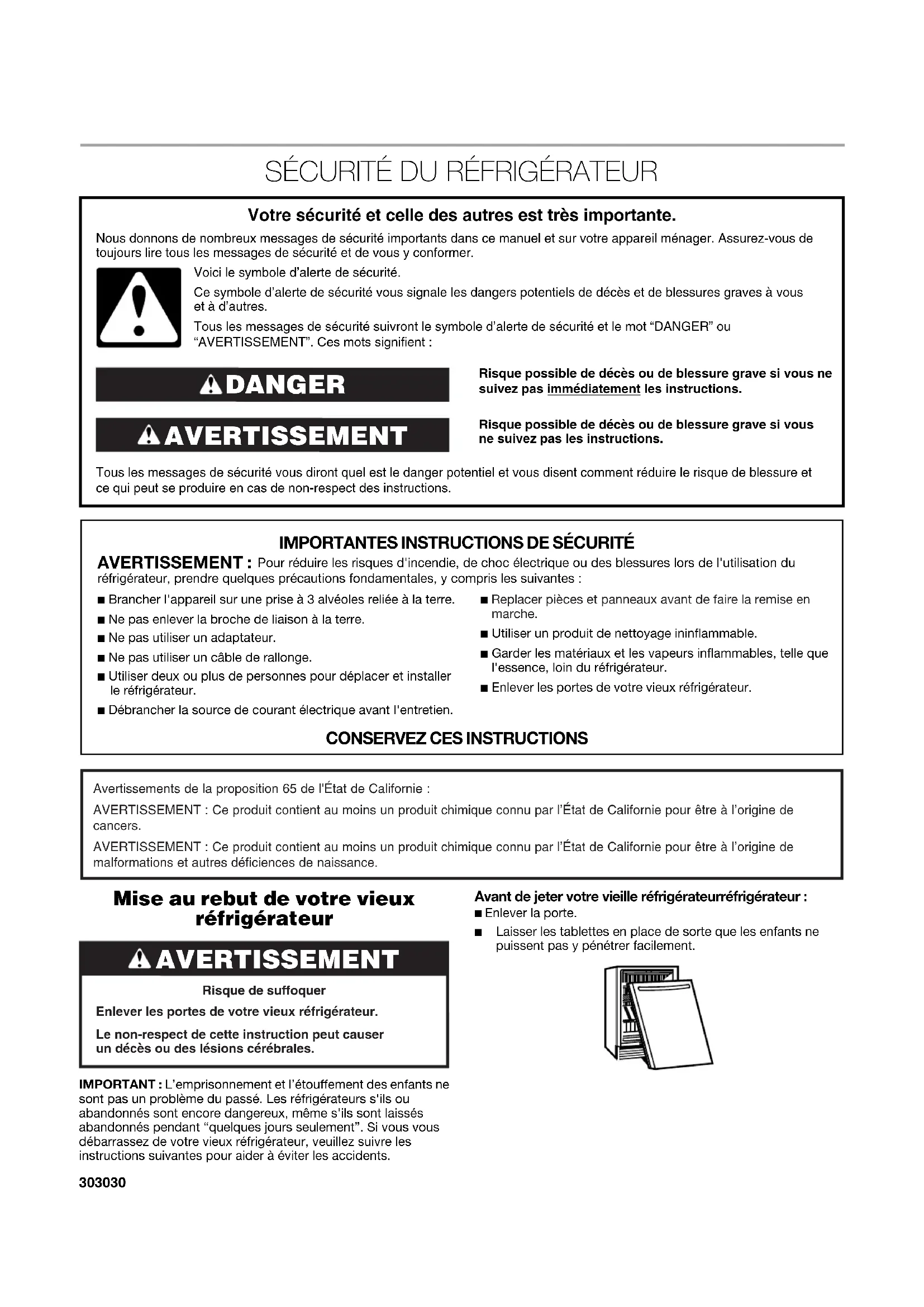 Mise au rebut de votre vieux réfrigérateur IMPORTANT : L’emprisonnement et l’étouffement des enfants ne sont pas un problème du passé. Les réfrigérateurs s'ils ou abandonnés sont encore dangereux, même s'ils sont laissés abandonnés pendant “quelques jours seulement”. Si vous vous débarrassez de votre vieux réfrigérateur, veuillez suivre les instructions suivantes pour aider à éviter les accidents.Avant de jeter votre vieille réfrigérateurréfrigérateur :■ Enlever la porte. ■ Laisser les tablettes en place de sorte que les enfants ne puissent pas y pénétrer facilement. Risque possible de décès ou de blessure grave si vous ne suivez pas immédiatement les instructions. Risque possible de décès ou de blessure grave si vous ne suivez pas les instructions. Tous les messages de sécurité vous diront quel est le danger potentiel et vous disent comment réduire le risque de blessure et ce qui peut se produire en cas de non-respect des instructions. Votre sécurité et celle des autres est très importante. Nous donnons de nombreux messages de sécurité importants dans ce manuel et sur votre appareil ménager. Assurez-vous de toujours lire tous les messages de sécurité et de vous y conformer. AVERTISSEMENT DANGER Voici le symbole d’alerte de sécurité.Ce symbole d’alerte de sécurité vous signale les dangers potentiels de décès et de blessures graves à vous et à d’autres.Tous les messages de sécurité suivront le symbole d’alerte de sécurité et le mot “DANGER” ou “AVERTISSEMENT”. Ces mots signifient :