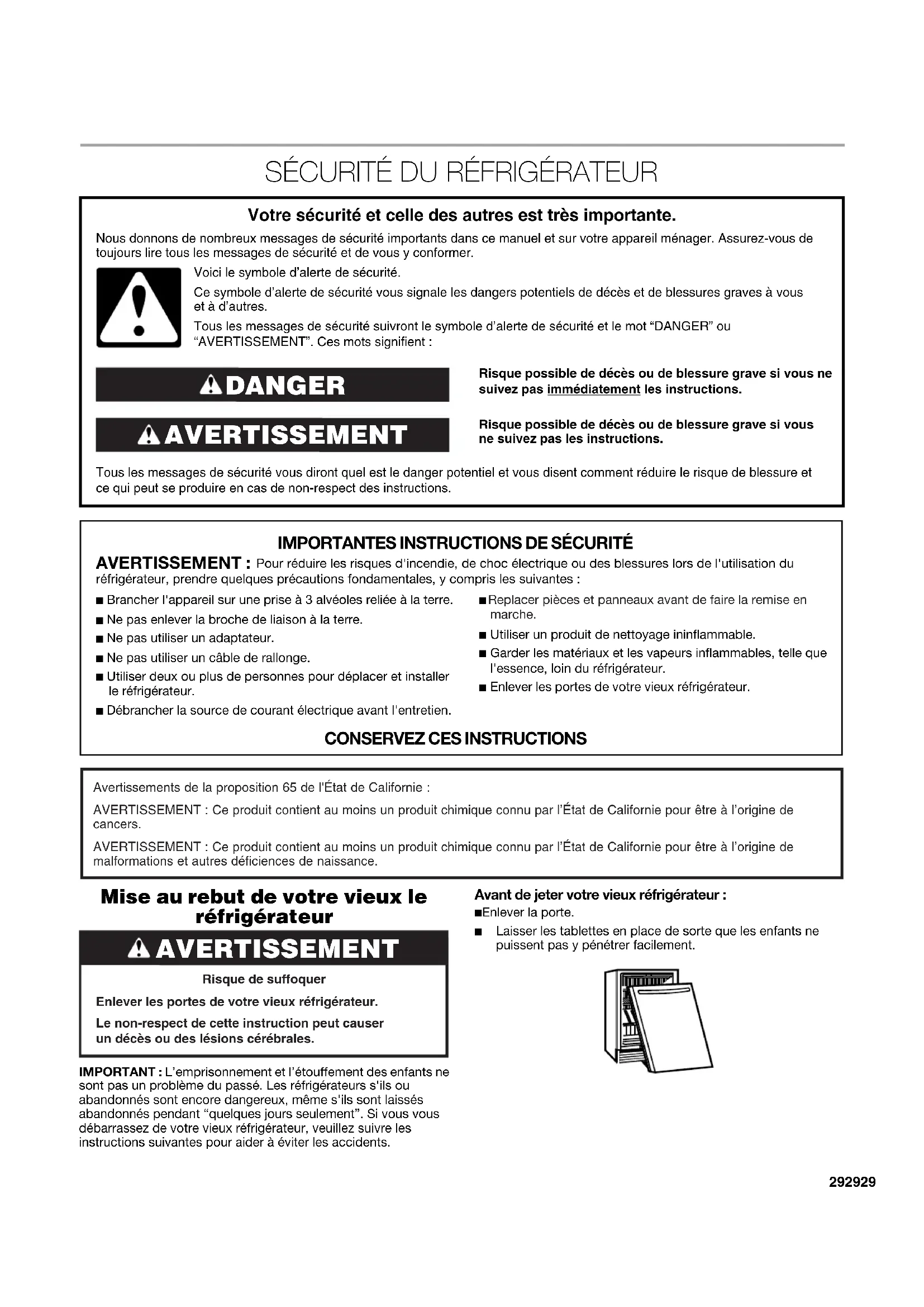 Mise au rebut de votre vieux le réfrigérateur IMPORTANT : L’emprisonnement et l’étouffement des enfants ne sont pas un problème du passé. Les réfrigérateurs s'ils ou abandonnés sont encore dangereux, même s'ils sont laissés abandonnés pendant “quelques jours seulement”. Si vous vous débarrassez de votre vieux réfrigérateur, veuillez suivre les instructions suivantes pour aider à éviter les accidents.Avant de jeter votre vieux réfrigérateur :■ Enlever la porte. ■ Laisser les tablettes en place de sorte que les enfants ne puissent pas y pénétrer facilement. Risque possible de décès ou de blessure grave si vous ne suivez pas immédiatement les instructions. Risque possible de décès ou de blessure grave si vous ne suivez pas les instructions. Tous les messages de sécurité vous diront quel est le danger potentiel et vous disent comment réduire le risque de blessure et ce qui peut se produire en cas de non-respect des instructions. Votre sécurité et celle des autres est très importante. Nous donnons de nombreux messages de sécurité importants dans ce manuel et sur votre appareil ménager. Assurez-vous de toujours lire tous les messages de sécurité et de vous y conformer. AVERTISSEMENT DANGER Voici le symbole d’alerte de sécurité.Ce symbole d’alerte de sécurité vous signale les dangers potentiels de décès et de blessures graves à vous et à d’autres.Tous les messages de sécurité suivront le symbole d’alerte de sécurité et le mot “DANGER” ou “AVERTISSEMENT”. Ces mots signifient :