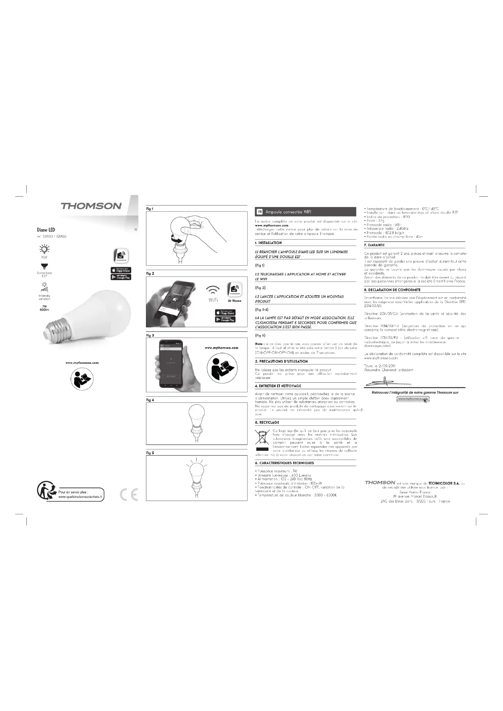 Smarthome France déclare que l’équipement est en conformité avec les exigences essentielles applicables de la Directive RED 2014/53/EU. Directive 2014/35/EU: (protection de la santé et sécurité des utilisateurs. Directive 2014/30/EU: (exigences de protection en ce qui concerne la compatibilité électromagnétique). Directive 2014/53/EU : (utilisation ef cace du spectre radioélectrique, de façon à éviter les interférences dommageables). La déclaration de conformité complète est disponible sur le site www.mythomson.com Tours, le 21/05/2019 Alexandre Chaverot, président Retrouvez l’intégralité de notre gamme Thomson sur Pour en savoir plus : www.quefairedemesdechets.fr est une marque de TECHNICOLOR S.A. ou de ses afliées utilisée sous licence par : SmartHome France 19 avenue Marcel Dassault ZAC des Deux Lions - 37200 Tours - France Fig 1 Fig 2 At Home WiFi Fig 3 www.mythomson.com. Fig 4 Fig 5 www.mythomson.com.Connected bulb WIFI Verbonden lamp WIFI GB NL Full instructions for your product are available on the website: www.mythomson.com. Download these instructions for more details on setting up and using your product Thomson.