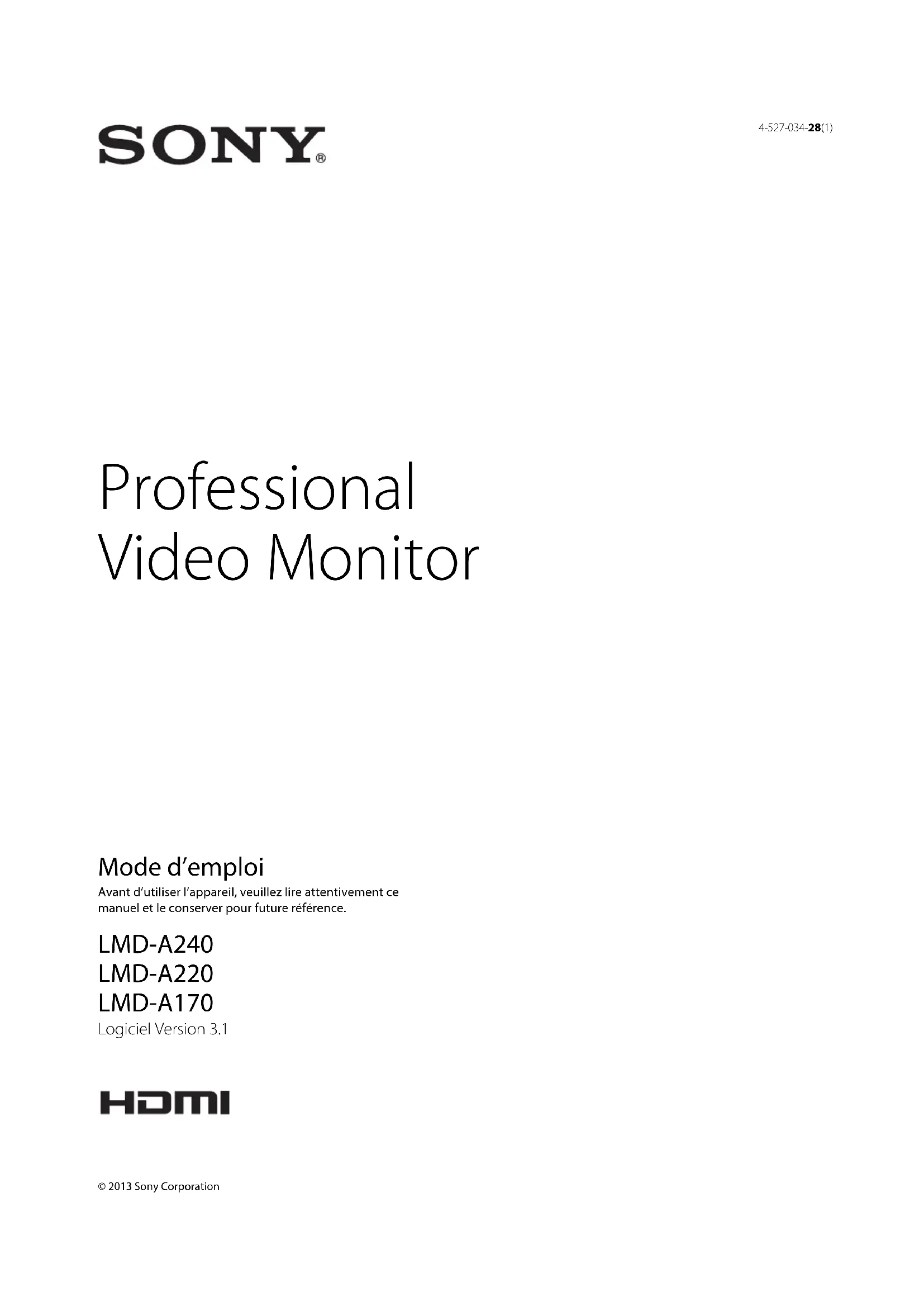 4-527-034-28(1) Professional Video Monitor Mode d’emploi Avant d’utiliser l’appareil, veuillez lire attentivement ce manuel et le conserver pour future référence. LMD-A240 LMD-A220 LMD-A170 © 2013 Sony Corporation Logiciel Version 3.12 Lisez ces instructions. Conservez ces instructions. Tenez compte de tous les avertissements. Suivez toutes les instructions. N’utilisez pas cet appareil à proximité d’eau. Nettoyez cet appareil uniquement avec un chiffon sec. Ne bloquez aucun orifice de ventilation. Installez cet appareil conformément aux instructions du fabricant. Ne l’installez pas à proximité de sources de chaleur comme des radiateurs, des registres de chaleur, des poêles ou d’autres appareils (y compris des amplificateurs) produisant de la chaleur. Ne désactivez pas le dispositif de sécurité de la fiche polarisée ou avec mise à la terre. Une fiche polarisée possède deux lames dont l’une est plus large que l’autre. Une fiche avec mise à la terre possède deux lames et une troisième broche de mise à la terre. La lame la plus large et la troisième broche sont fournies pour votre sécurité. Si la fiche fournie ne rentre pas dans votre prise de courant, consultez un électricien afin qu’il remplace la prise obsolète. Protégez le cordon d’alimentation afin que personne ne marche dessus et qu’il ne se coince pas, en particulier au niveau de la fiche, de la prise de courant et à l’endroit où il sort de l’appareil. N’utilisez que les fixations et accessoires indiqués par le fabricant. Utilisez l’appareil uniquement avec le chariot, le support, le trépied ou la table indiqué par le fabricant ou vendu avec l’appareil. Lorsque vous utilisez un chariot, faites attention lorsque vous déplacez le chariot et l’appareil ensemble afin d’éviter de vous blesser en cas de chute. Débranchez cet appareil en cas d’orage ou lorsqu’il n’est pas utilisé pendant de longues périodes. Faites appel à un technicien qualifié pour toute réparation/entretien. L’entretien/réparation est nécessaire lorsque l’appareil a été endommagé de quelque façon que ce soit, par exemple si le cordon ou la fiche d’alimentation a été endommagé, si du liquide a été renversé ou si des objets sont tombés dans l’appareil, si l’appareil a été exposé à la pluie ou à l’humidité, s’il ne fonctionne pas normalement ou s’il a subi une chute. AVERTISSEMENT Afin de réduire les risques d’incendie ou d’électrocution, ne pas exposer cet appareil à la pluie ou à l’humidité. Afin d’écarter tout risque d’électrocution, garder le coffret fermé. Ne confier l’entretien de l’appareil qu’à un personnel qualifié. AVERTISSEMENT Cet appareil doit être relié à la terre. AVERTISSEMENT Lors de l’installation de l’appareil, incorporer un dispositif de coupure dans le câblage fixe ou brancher la fiche d’alimentation dans une prise murale facilement accessible proche de l’appareil. En cas de problème lors du fonctionnement de l’appareil, enclencher le dispositif de coupure d’alimentation ou débrancher la fiche d’alimentation. AT TE NT IO N Ce moniteur vidéo professionnel ne doit être utilisé qu’avec le support de moniteur spécifié. Pour plus de détails sur les supports compatibles, voir « Spécifications ». L’installation du moniteur vidéo professionnel sur tout autre support peut se révéler instable et provoquer des blessures. Attention - lorsque le produit est installé en rack : (Pour LMD-A220/A170)