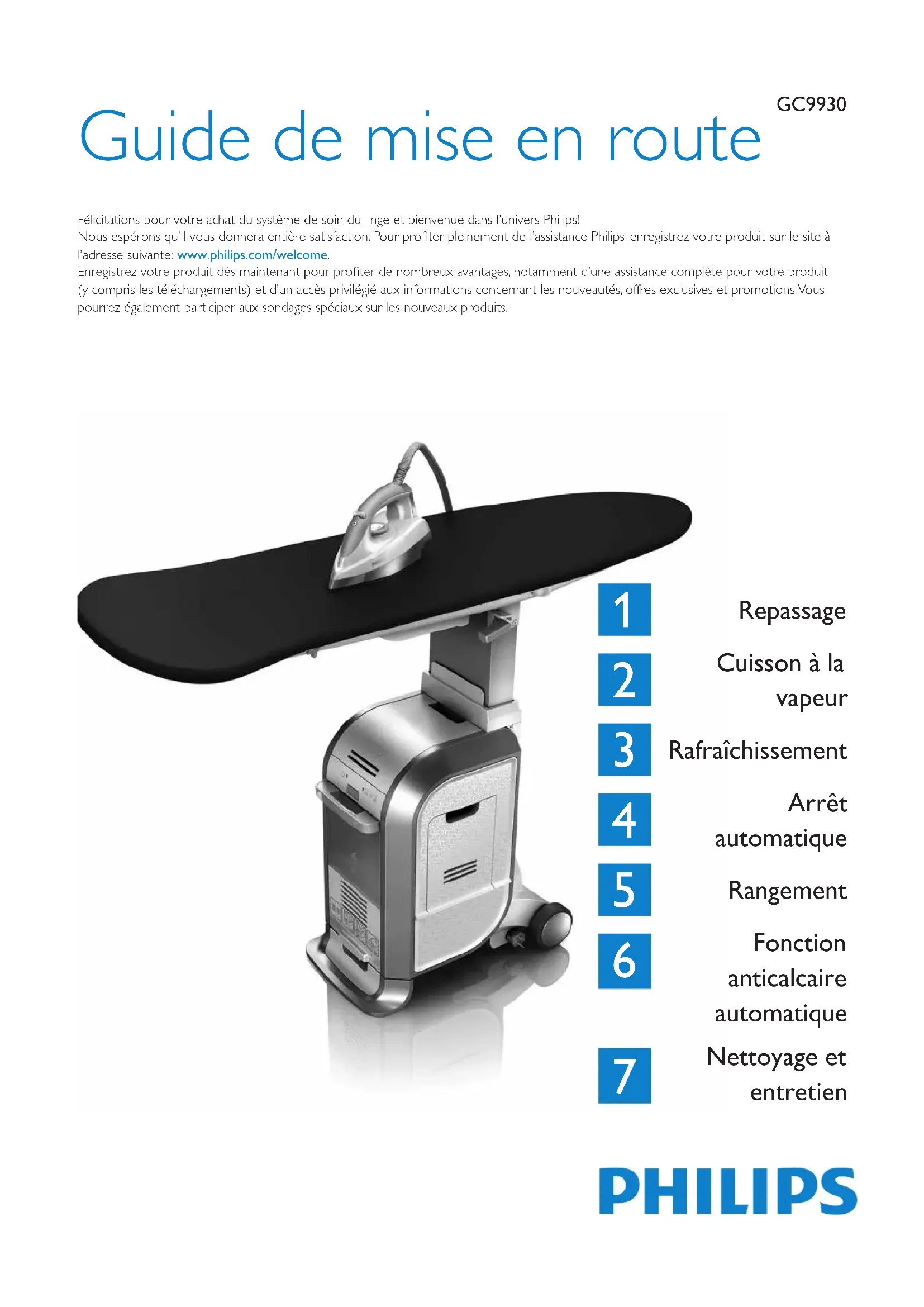 Félicitations pour votre achat du système de soin du linge et bienvenue dans l’univers Philips! Nous espérons qu’il vous donnera entière satisfaction. Pour proter pleinement de l’assistance Philips, enregistrez votre produit sur le site à l’adresse suivante: www.philips.com/welcome. Enregistrez votre produit dès maintenant pour proter de nombreux avantages, notamment d’une assistance complète pour votre produit (y compris les téléchargements) et d’un accès privilégié aux informations concernant les nouveautés, offres exclusives et promotions. Vous pourrez également participer aux sondages spéciaux sur les nouveaux produits.
