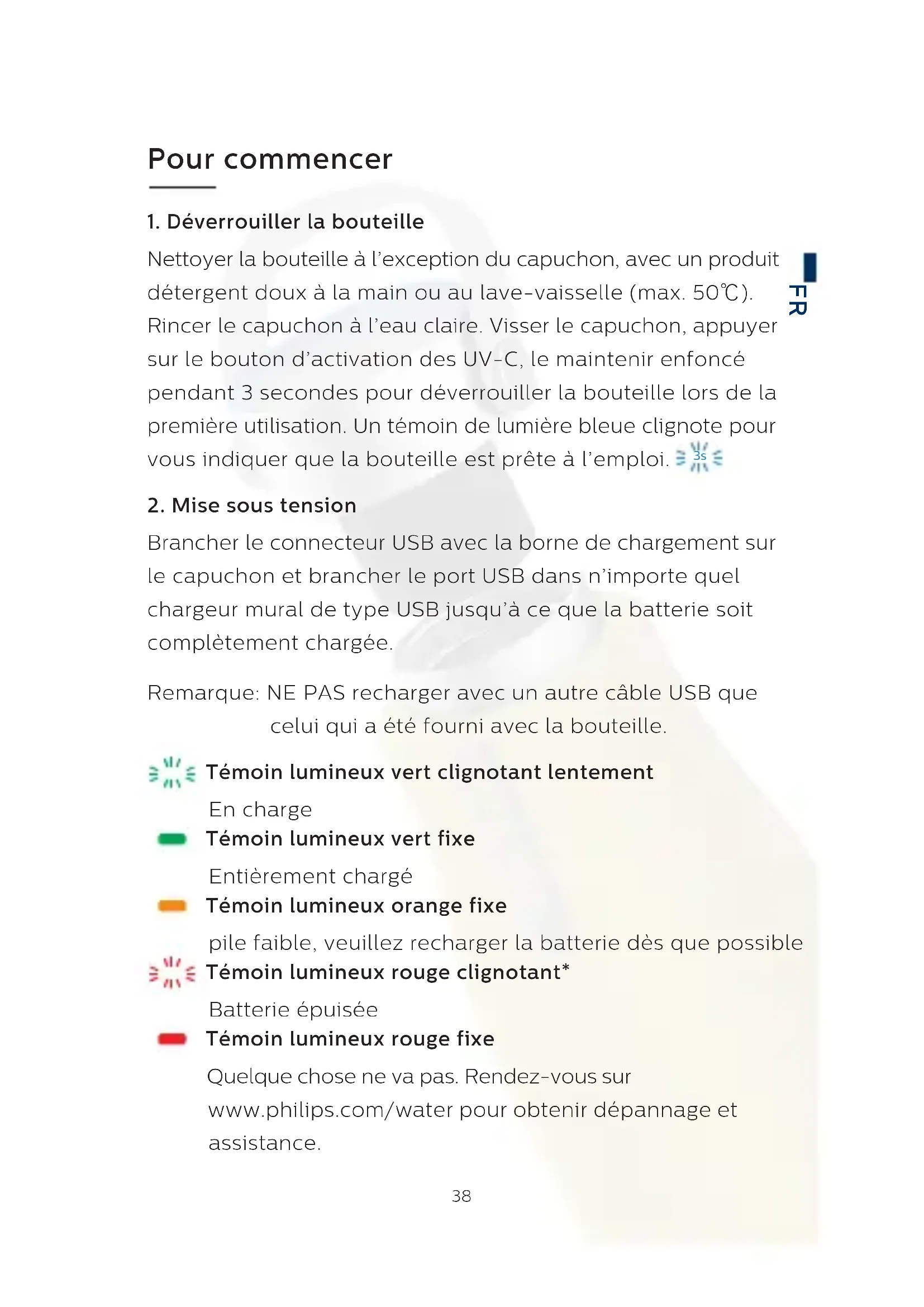 Brancher le connecteur USB avec la borne de chargement sur le capuchon et brancher le port USB dans n’importe quel chargeur mural de type USB jusqu’à ce que la batterie soit complètement chargée. Remarque: NE PAS recharger avec un autre câble USB que celui qui a été fourni avec la bouteille. Témoin lumineux vert clignotant lentement En charge Témoin lumineux vert fixe Entièrement chargé Témoin lumineux orange fixe pile faible, veuillez recharger la batterie dès que possible Témoin lumineux rouge clignotant* Batterie épuisée Témoin lumineux rouge fixe Quelque chose ne va pas. Rendez-vous sur www.philips.com/water pour obtenir dépannage et assistance. Pour commencer 3s* Lorsque la bouteille n’a plus de batterie, elle s’éteint complètement. Veuillez alors la recharger et la déverrouiller en reprenant l’étape 1. Désinfection de la bouteille