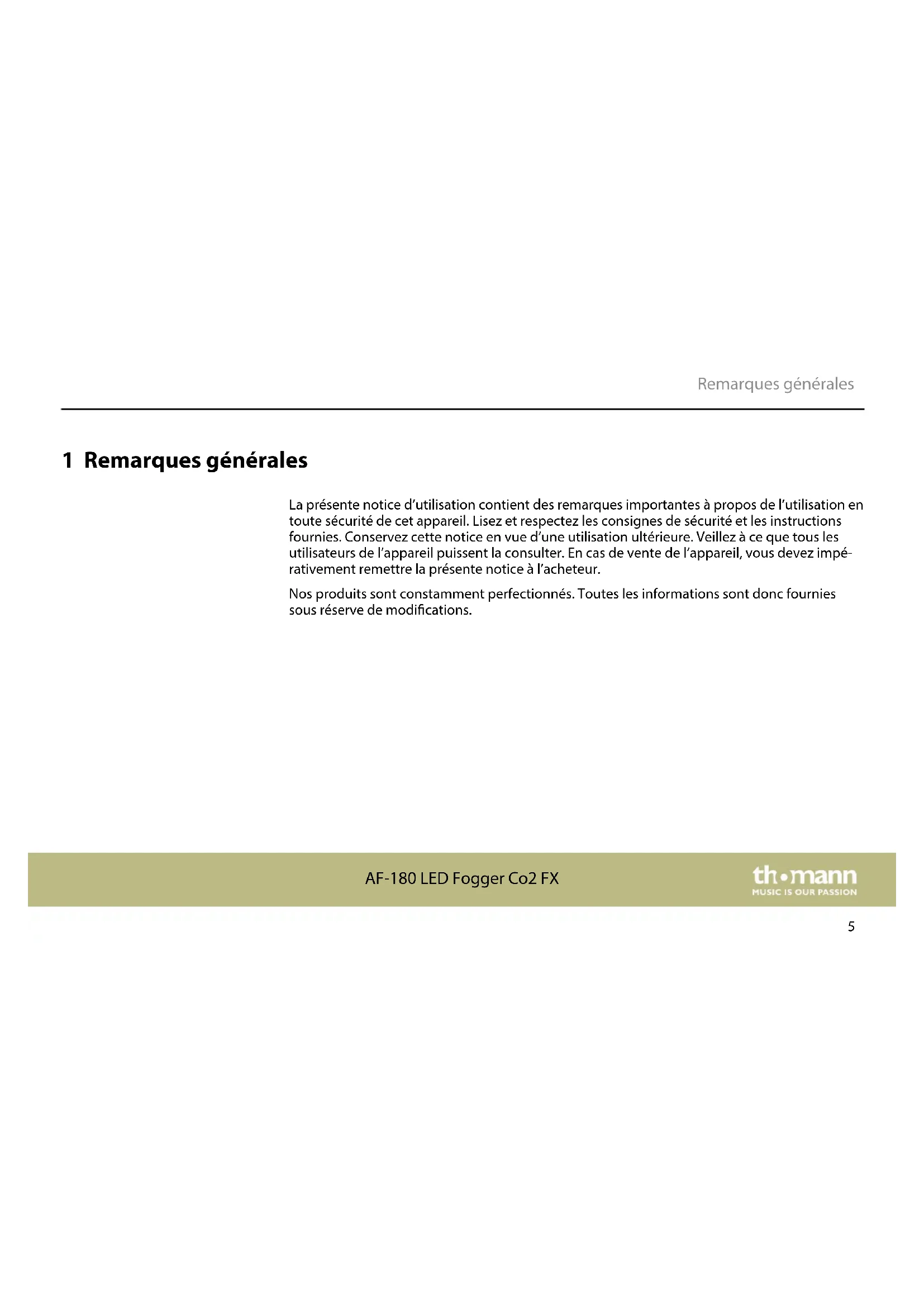 AF-180 LED Fogger Co2 FX 112 Consignes de sécurité Cet appareil est destiné à générer du brouillard articiel par l'évaporation du liquide à brouil‐ lard et à produire un eet d’éclairage électronique au moyen de la technique LED. Cet appareil a été conçu pour un usage professionnel et ne convient pas à une utilisation domestique. Uti‐ lisez l’appareil uniquement selon l’utilisation prévue, telle que décrite dans cette notice d’utili‐ sation. Toute autre utilisation, de même qu’une utilisation sous d’autres conditions de fonc‐ tionnement, sera considérée comme non conforme et peut occasionner des dommages corporels et matériels. Aucune responsabilité ne sera assumée en cas de dommages résultant d’une utilisation non conforme. L’appareil doit uniquement être utilisé par des personnes en pleine possession de leurs capa‐ cités physiques, sensorielles et mentales et disposant des connaissances et de l’expérience requises. Toutes les autres personnes sont uniquement autorisées à utiliser l’appareil sous la surveillance ou la direction d’une personne chargée de leur sécurité. Prolongez la durée de vie de l’appareil par des arrêts réguliers en évitant de mettre l’appareil souvent en marche et en arrêt. L’appareil ne convient pas au fonctionnement en continu. Utilisation conforme Consignes de sécurité