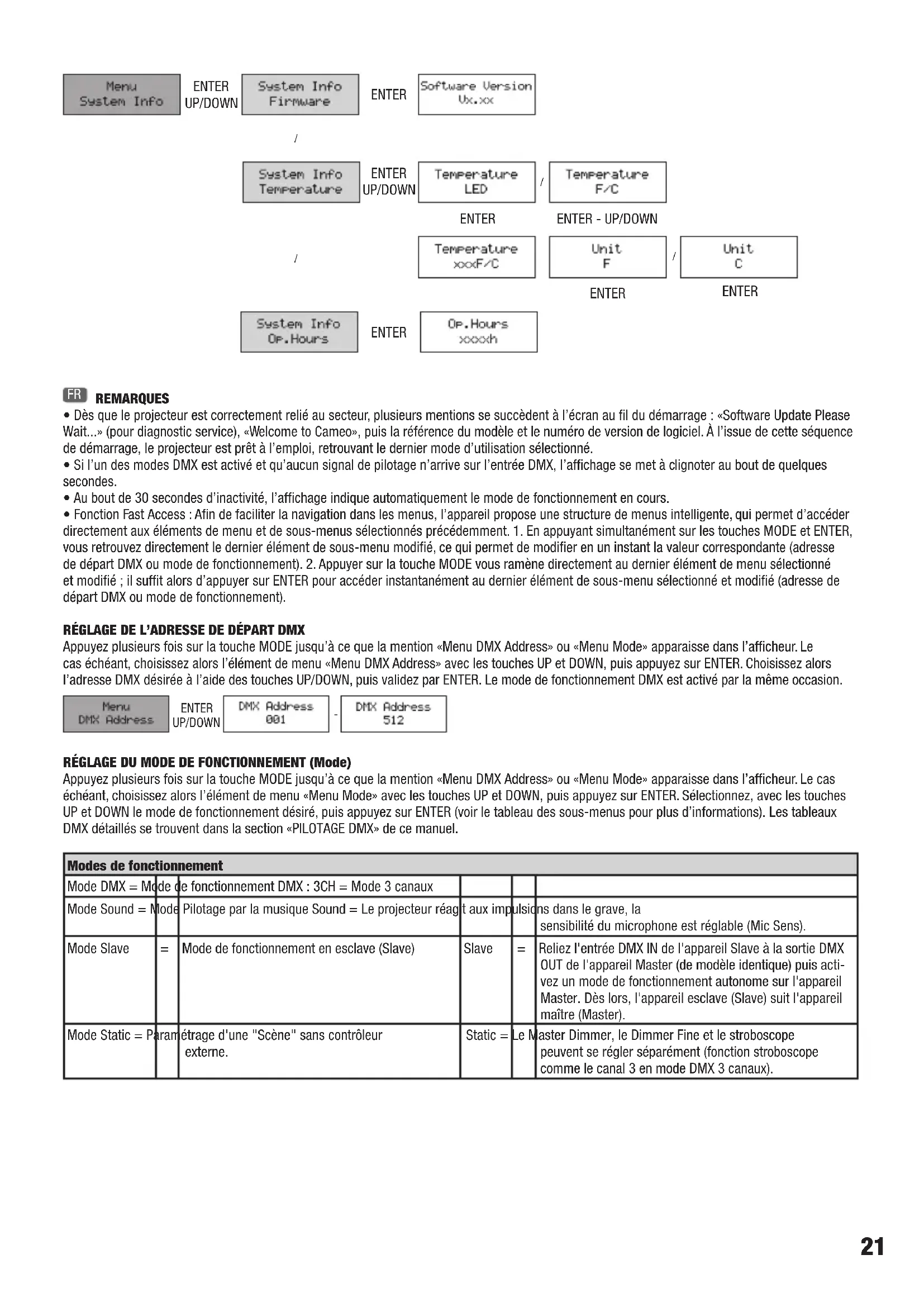 Pour accéder aux informations système, appuyez plusieurs fois sur la touche MODE jusqu'à ce que la mention «Menu DMX Addr» ou «Menu Mode» apparaisse dans l'afficheur. Sélectionnez alors, avec les touches UP et DOWN, l'objet de menu «Menu System Info», puis appuyez sur ENTER. Sélectionnez l'objet de sous-menu désiré avec les touches UP et DOWN, puis appuyez sur ENTER pour visualiser les informations correspondantes.