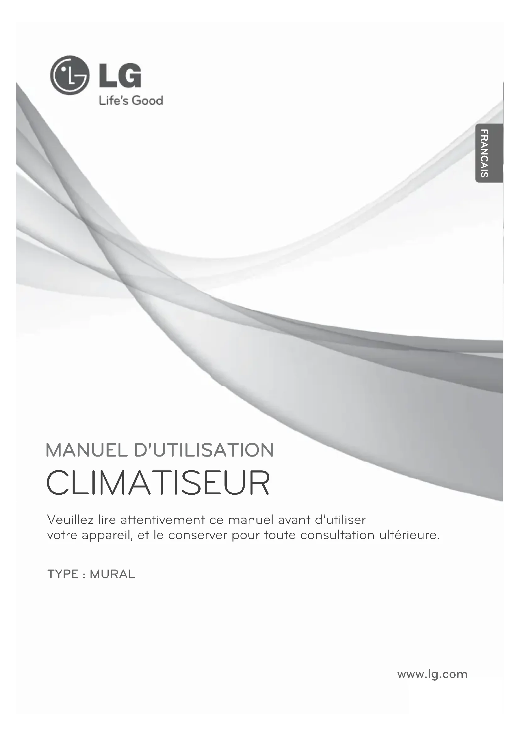 Mettez le climatiseur hors tension, débranchez le cordon d’alimentation et contactez le centre de service. Il y a fuite d’eau au niveau de l’unité intérieure lorsque le niveau d’humidité est faible. Le cordon d’alimentation est endommagé ou produit une chaleur excessive. Un commutateur, un disjonc- teur (sécurité, mise à la masse) ou un fusible ne fonctionnent pas normalement. Le climatiseur ne fonctionne pas. Le climatiseur est débranché. Vérifiez si le cordon d’alimentation est branché sur la sortie. Un fusible est grillé ou le cordon d’alimentation est bloqué. Remplacez le fusible ou vérifiez si le disjoncteur a sauté. Il y a une coupure élec- trique. Mettez le climatiseur hors tension lorsque survient une coupure électrique. Lorsque l’ali- mentation est restaurée, patientez pendant 3 minutes, puis mettez le climatiseur en marche. La tension est très élevée ou très faible. Vérifiez si le disjoncteur a sauté. Le climatiseur s'est ar- rêté automatiquement à une heure prédéfinie. Appuyez de nouveau sur le bouton de mise en marche. DEPANNAGE20 DEPANNAGE FRANÇAIS Problème Causes probables Mesures correctives Le climatiseur ne génère pas d’air frais. L’air ne circule pas nor- malement. Assurez-vous que des rideaux, des persiennes ou de meubles ne bloquent pas la façade avant du climatiseur. Le filtre à air est en- crassé. Nettoyez le filtre à air une fois toutes les 2 se- maines. Voir «Nettoyage du filtre à air» pour plus d’informations. La température am- biante est très élevée. En été, le refroidissement de l’air intérieur peut prendre plus de temps. Dans ce cas, sélection- nez le mode refroidissement par jets d’air pour refroidir l’air intérieur rapidement. L’air froid s’échappe du local. Assurez-vous qu’il n’y a pas de fuite d’air au niveau des points de ventilation du local. La température souhaitée est supérieure à la tempéra- ture définie. Réglez la température souhaitée à un niveau in- férieur à la température actuelle. Il existe une source de chauffage à proximité du climatiseur. Evitez d’utiliser un générateur de chaleur comme un four électrique ou un brûleur à gaz lorsque le climatiseur est en marche. Le mode circulation de l’air est sélectionné. En mode circulation de l’air, l’air est soufflé du climatiseur sans refroidir ou chauffer l'air in- térieur. Changez le mode de fonctionnement en mode refroidissement. Il est impossible de régler la vitesse de ventilation. Le mode automatique, refroidissement par jet d’air ou déshumidifica- tion est sélectionné. Dans certains modes de fonctionnement comme le mode refroidissement par jets d’air ou déshumidification, vous ne pouvez pas ré- gler la vitesse de ventilation. Sélectionnez un mode de fonctionnement qui vous permet de régler la vitesse de ventilation. Il est impossible de régler la température. Le mode circulation de l’air ou refroidissement par jets d’air est sélec- tionné. Dans certains modes de fonctionnement comme le mode circulation de l’air ou re- froidissement par jets d’air, vous ne pouvez pas régler la température. Sélectionnez un mode de fonctionnement qui vous permet de régler la température.www.lg.com