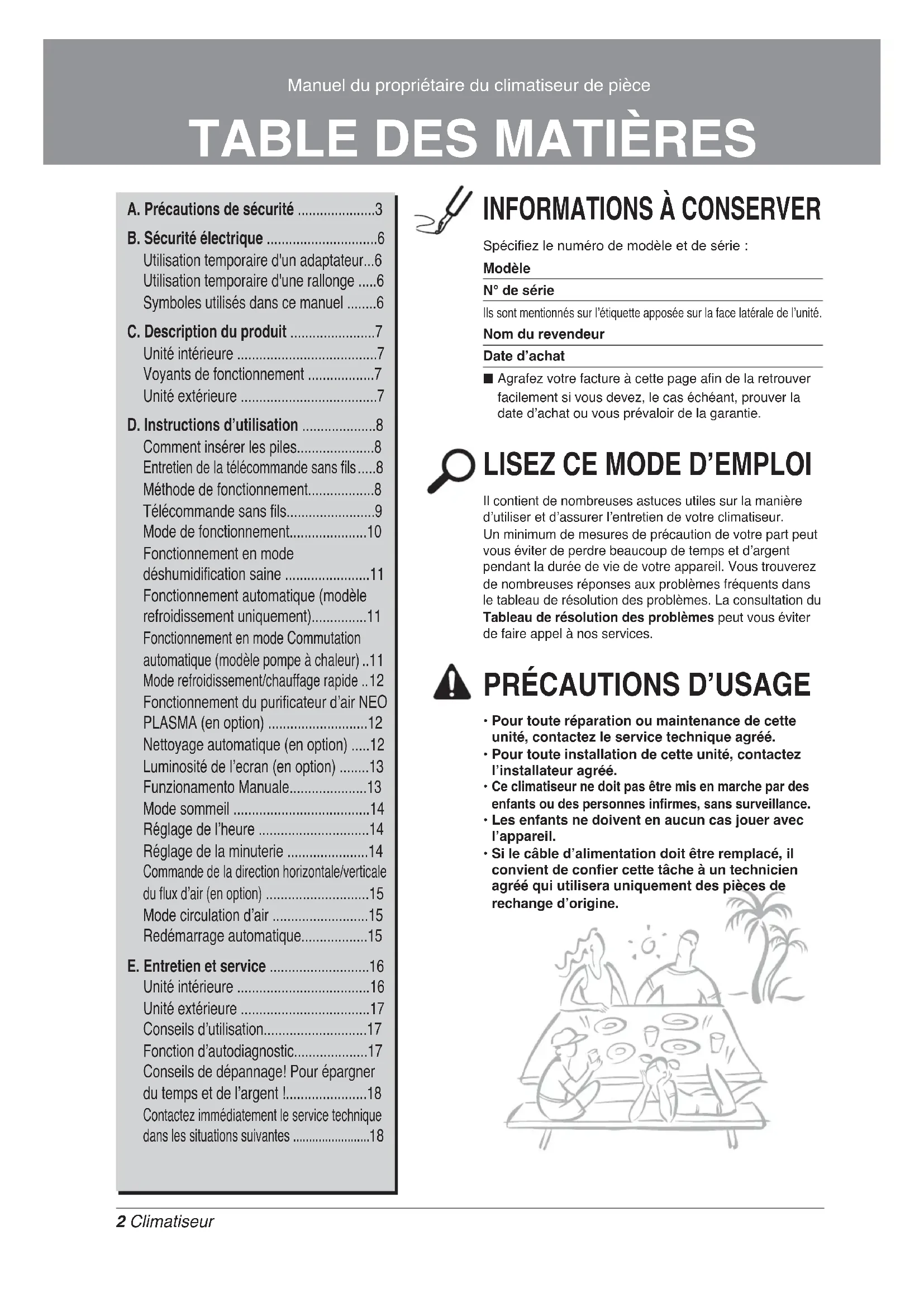- Si le câble dʼalimentation doit être remplacé, il convient de confier cette tâche à un technicien agréé qui utilisera uniquement des pièces de rechange dʼorigine. A. Précautions de sécurité .....................3 B. Sécurité électrique ..............................6 Utilisation temporaire d'un adaptateur...6 Utilisation temporaire d'une rallonge .....6 Symboles utilisés dans ce manuel ........6 C. Description du produit .......................7 Unité intérieure ......................................7 Voyants de fonctionnement ..................7 Unité extérieure .....................................7 D. Instructions dʼutilisation ....................8 Comment insérer les piles.....................8 Entretien de la télécommande sans fils