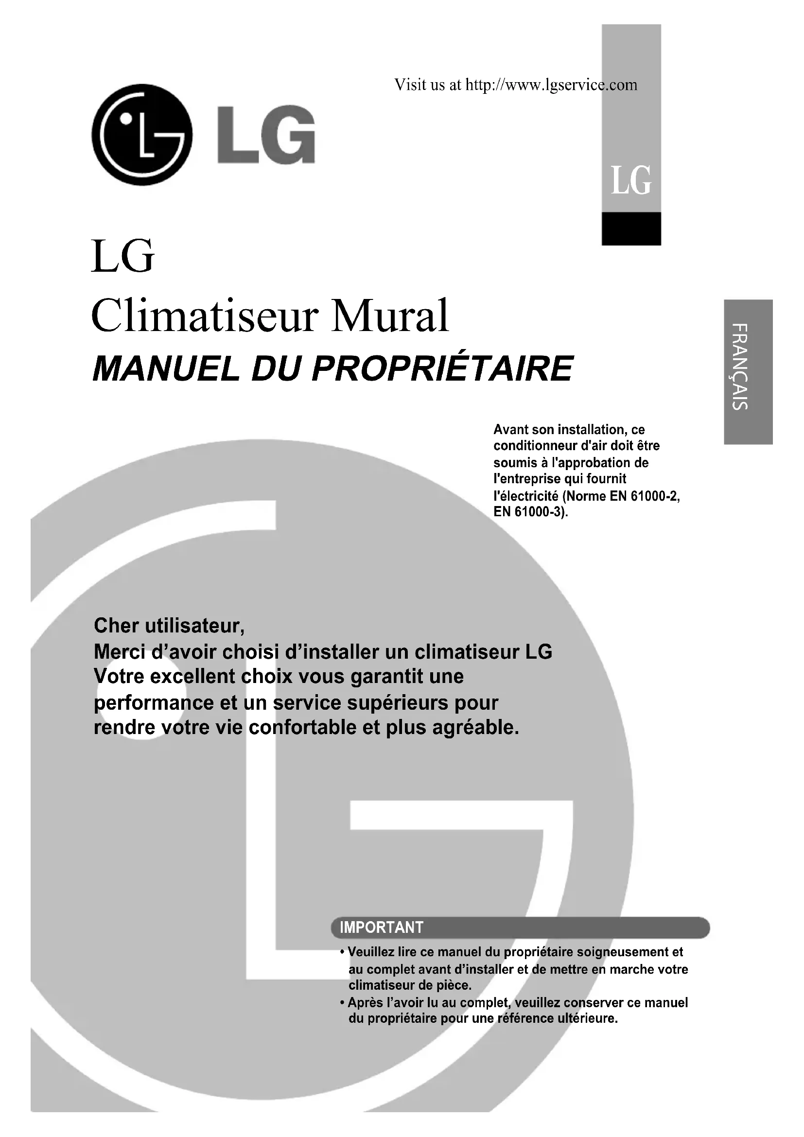 Visit us at http://www.lgservice.com IMPORTANT• Veuillez lire ce manuel du propriétaire soigneusement et au complet avant d’installer et de mettre en marche votre climatiseur de pièce.• Après l’avoir lu au complet, veuillez conserver ce manuel du propriétaire pour une référence ultérieure.Avant son installation, ce conditionneur d'air doit être soumis à l'approbation de l'entreprise qui fournit l'électricité (Norme EN 61000-2, EN 61000-3). Cher utilisateur, Merci d’avoir choisi d’installer un climatiseur LG Votre excellent choix vous garantit une performance et un service supérieurs pour rendre votre vie confortable et plus agréable. FRANÇAIS2 Climatiseur Mural Manuel du propriétaire du climatiseur de pièce