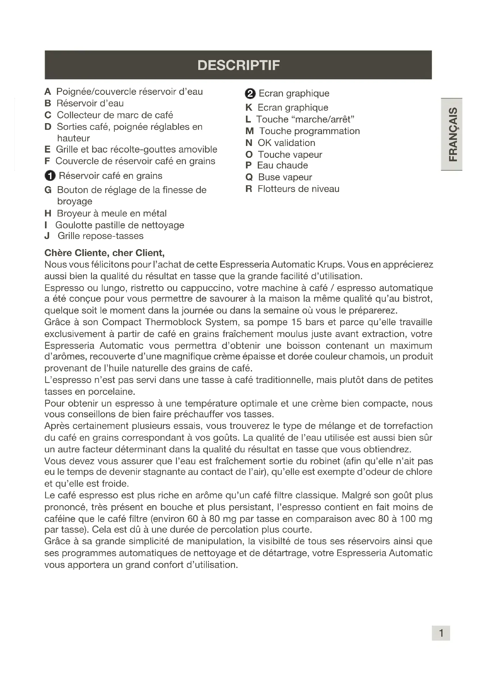 FRANÇAIS Chère Cliente, cher Client, Nous vous félicitons pour l’achat de cette Espresseria Automatic Krups. Vous en apprécierez aussi bien la qualité du résultat en tasse que la grande facilité d’utilisation. Espresso ou lungo, ristretto ou cappuccino, votre machine à café / espresso automatique a été conçue pour vous permettre de savourer à la maison la même qualité qu’au bistrot, quelque soit le moment dans la journée ou dans la semaine où vous le préparerez. Grâce à son Compact Thermoblock System, sa pompe 15 bars et parce qu’elle travaille exclusivement à partir de café en grains fraîchement moulus juste avant extraction, votre Espresseria Automatic vous permettra d’obtenir une boisson contenant un maximum d’arômes, recouverte d’une magnique crème épaisse et dorée couleur chamois, un produit provenant de l’huile naturelle des grains de café. L’espresso n’est pas servi dans une tasse à café traditionnelle, mais plutôt dans de petites tasses en porcelaine. Pour obtenir un espresso à une température optimale et une crème bien compacte, nous vous conseillons de bien faire préchauffer vos tasses. Après certainement plusieurs essais, vous trouverez le type de mélange et de torrefaction du café en grains correspondant à vos goûts. La qualité de l’eau utilisée est aussi bien sûr un autre facteur déterminant dans la qualité du résultat en tasse que vous obtiendrez. Vous devez vous assurer que l’eau est fraîchement sortie du robinet (an qu’elle n’ait pas eu le temps de devenir stagnante au contact de l’air), qu’elle est exempte d’odeur de chlore et qu’elle est froide. Le café espresso est plus riche en arôme qu’un café ltre classique. Malgré son goût plus prononcé, très présent en bouche et plus persistant, l’espresso contient en fait moins de caféine que le café ltre (environ 60 à 80 mg par tasse en comparaison avec 80 à 100 mg par tasse). Cela est dû à une durée de percolation plus courte. Grâce à sa grande simplicité de manipulation, la visibilté de tous ses réservoirs ainsi que ses programmes automatiques de nettoyage et de détartrage, votre Espresseria Automatic vous apportera un grand confort d’utilisation. DESCRIPTIF A Poignée/couvercle réservoir d’eau B Réservoir d’eau C Collecteur de marc de café D Sorties café, poignée réglables en hauteur E Grille et bac récolte-gouttes amovible F Couvercle de réservoir café en grains