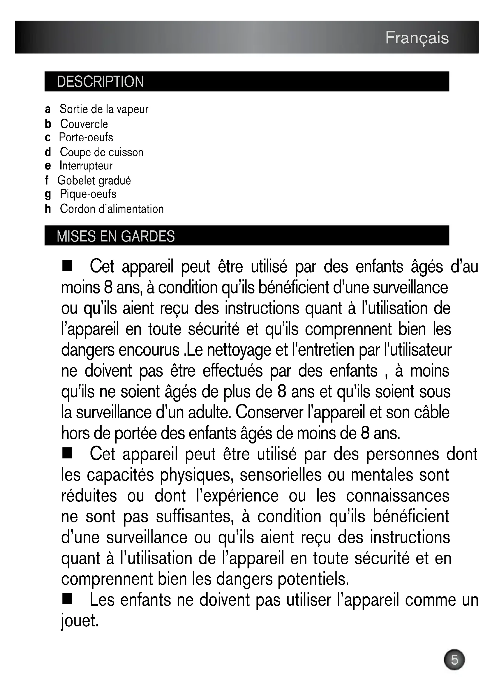 a Sortie de la vapeur b Couvercle c Porte-oeufs d Coupe de cuisson e Interrupteur f Gobelet gradué g Pique-oeufs h Cordon d’alimentation Cet appareil peut être utilisé par des enfants âgés d’au moins 8 ans, à condition qu’ils bénéficient d’une surveillance ou qu’ils aient reçu des instructions quant à l’utilisation de l’appareil en toute sécurité et qu’ils comprennent bien les dangers encourus .Le nettoyage et l’entretien par l’utilisateur ne doivent pas être effectués par des enfants , à moins qu’ils ne soient âgés de plus de 8 ans et qu’ils soient sous la surveillance d’un adulte. Conserver l’appareil et son câble hors de portée des enfants âgés de moins de 8 ans. Cet appareil peut être utilisé par des personnes dont les capacités physiques, sensorielles ou mentales sont réduites ou dont l’expérience ou les connaissances ne sont pas suffisantes, à condition qu’ils bénéficient d’une surveillance ou qu’ils aient reçu des instructions quant à l’utilisation de l’appareil en toute sécurité et en comprennent bien les dangers potentiels. Les enfants ne doivent pas utiliser l’appareil comme un jouet.6 Français Cet appareil n’est pas prévu pour être utilisé par des personnes (y compris les enfants) dont les capacités physiques, sensorielles ou mentales sont réduites, ou des personnes dénuées d’expérience ou de connaissance, sauf si elles ont pu bénéficier, par l’intermédiaire d’une personne responsable de leur sécurité, d’une surveillance ou d’instructions préalables concernant l’utilisation de l’appareil. Il convient de surveiller les enfants pour s’assurer qu’ils ne jouent pas avec l’appareil. Votre appareil a été conçu pour un usage domestique seulement. Il n’a pas été conçu pour être utilisé dans les cas suivants qui ne sont pas couverts par la garantie : – dans des coins de cuisines réservés au personnel dans des magasins, bureaux et autres environnements professionnels, – dans des fermes, – par les clients des hôtels, motels et autres environnements à caractère résidentiel, – dans des environnements de type chambres d’hôtes. Si le câble de cet appareil est endommagé, il doit être remplacé par le fabricant, son service après-vente ou des personnes de qualification similaire afin d’éviter un danger. Cet appareil ne doit pas être immergé. Cet appareil n’est pas destiné à être mis en fonctionnement au moyen d’une minuterie extérieure ou par un système de commande à distance séparé.7 Français Eviter de se blesser avec le brise-coquille. Attention: la surface de l’élément chauffant est soumise à la chaleur résiduelle après utilisation. Attention risque de blessure en cas de mauvaise utilisation de l’appareil. Utiliser un chiffon humide ou une éponge avec du liquide vaisselle pour nettoyer les accessoires et les parties en contact avec les aliments. Rincer avec un chiffon ou une éponge humide. Sécher les accessoires et les parties en contact avec les aliments avec un chiffon sec. Pour votre sécurité, cet appareil est conforme aux normes et réglementations applicables (Directives Basse Tension, Compatibilité Electromagnétique, Matériaux en contact des aliments, Environnement, ...). Lire attentivement et garder à portée de main les instructions de cette notice, communes aux différentes versions suivant les accessoires livrés avec votre appareil et les garder à portée de main. Ne jamais utiliser l’appareil sans surveillance. Ne jamais brancher l’appareil lorsqu’il n’est pas utilisé. A FAIRE Si un accident se produit, passez de l’eau froide immédiatement sur la brûlure et appelez un médecin si nécessaire. Les fumées de cuisson peuvent être dangereuses pour les animaux ayant un système de respiration particulièrement sensible, comme les oiseaux. Nous conseillons aux propriétaires d’oiseaux de les éloigner du lieu de cuisson. Enlever tous les emballages, autocollants ou accessoires divers à l’intérieur comme à l’extérieur de l’appareil. Dérouler entièrement le cordon. Si l’appareil est utilisé au centre de la table, le mettre hors de portée des enfants. Lors de la première utilisation, nettoyer l’appareil et ses accessoires avec un linge humide. Si une rallonge électrique est utilisée, elle doit être de section au moins équivalente et avec prise de terre incorporée. (pour les produits avec terre). Si une rallonge électrique est utilisée, elle doit être de section au moins équivalente (pour les produits sans terre).8 Français Ne brancher l’appareil que sur une prise avec terre incorporée. Veillez à l’emplacement du cordon avec ou sans rallonge, prendre toutes les précautions nécessaires afin de ne pas gêner la circulation des convives autour de la table de telle sorte que personne ne s’entrave dedans. Vérifier que l’installation électrique est compatible avec la puissance et la tension indiquées sous l’appareil. Lors de la première utilisation, un léger dégagement d’odeur ou de fumée peut se produire.