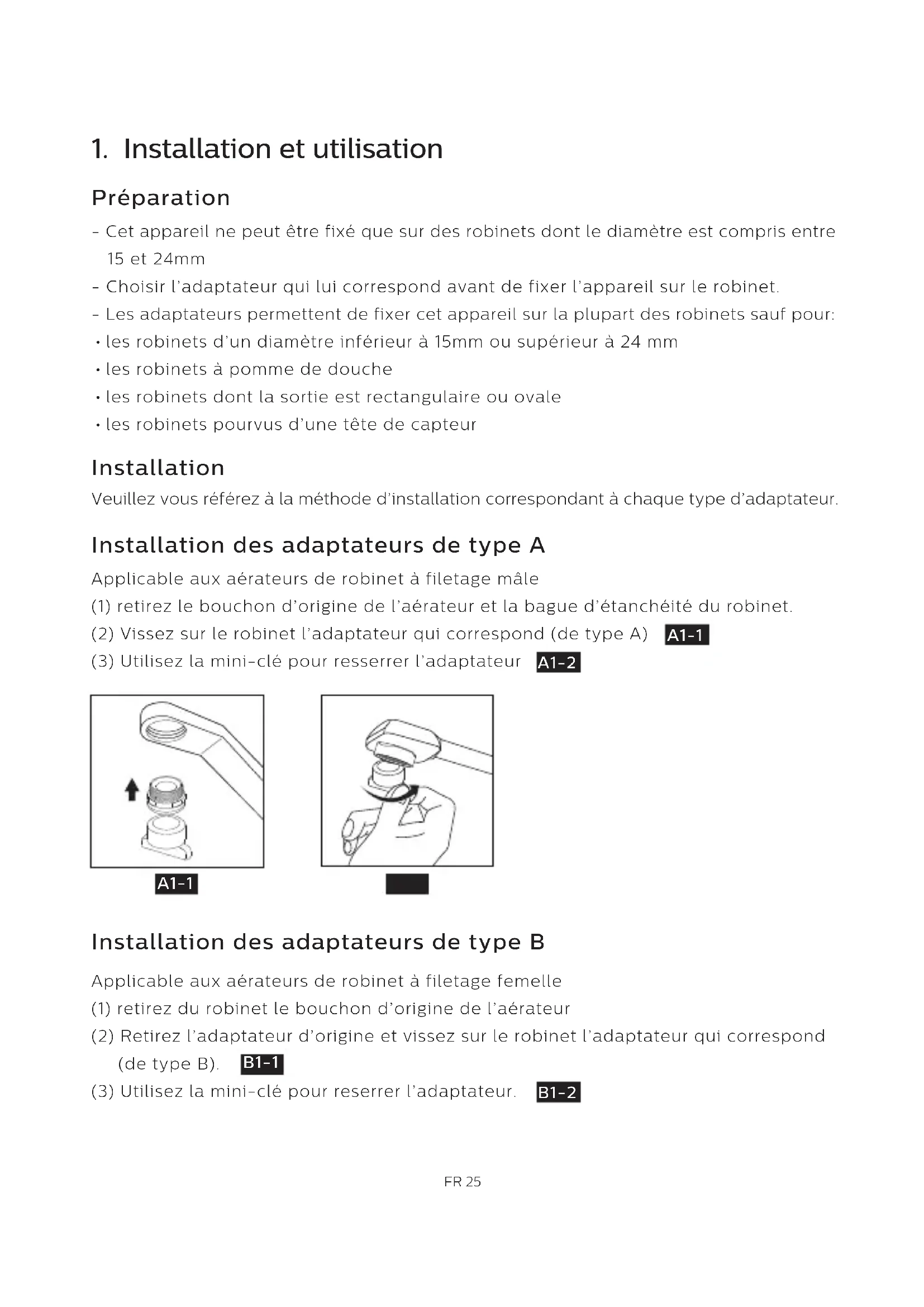 - les robinets pourvus d’une tête de capteur Installation Préparation Veuillez vous référez à la méthode d’installation correspondant à chaque type d’adaptateur. Installation des adaptateurs de type A Applicable aux aérateurs de robinet à filetage mâle (1) retirez le bouchon d’origine de l’aérateur et la bague d’étanchéité du robinet. (2) Vissez sur le robinet l’adaptateur qui correspond (de type A) (3) Utilisez la mini-clé pour resserrer l’adaptateur Installation des adaptateurs de type B Applicable aux aérateurs de robinet à filetage femelle (1) retirez du robinet le bouchon d’origine de l’aérateur (2) Retirez l’adaptateur d’origine et vissez sur le robinet l’adaptateur qui correspond (de type B). (3) Utilisez la mini-clé pour reserrer l’adaptateur. FR 25 A1-1 A1-1 A1-2 A1-2Installation des adaptateurs de type C Applicable for faucets other than A or B with a diameter of 15mm-21mm. Please prepare a slotted screwdriver in advance before installing. C-type adaptor. (1) la nécessité de la bague d’étanchéité intérieure ou extérieure de l’adaptateur de type C dépend de la dimension de la sortie du robinet. (2) Combinez l’adaptateur de type A avec l’adaptateur de type C (3) Ajustez et vissez l’adaptateur combiné sur le robinet