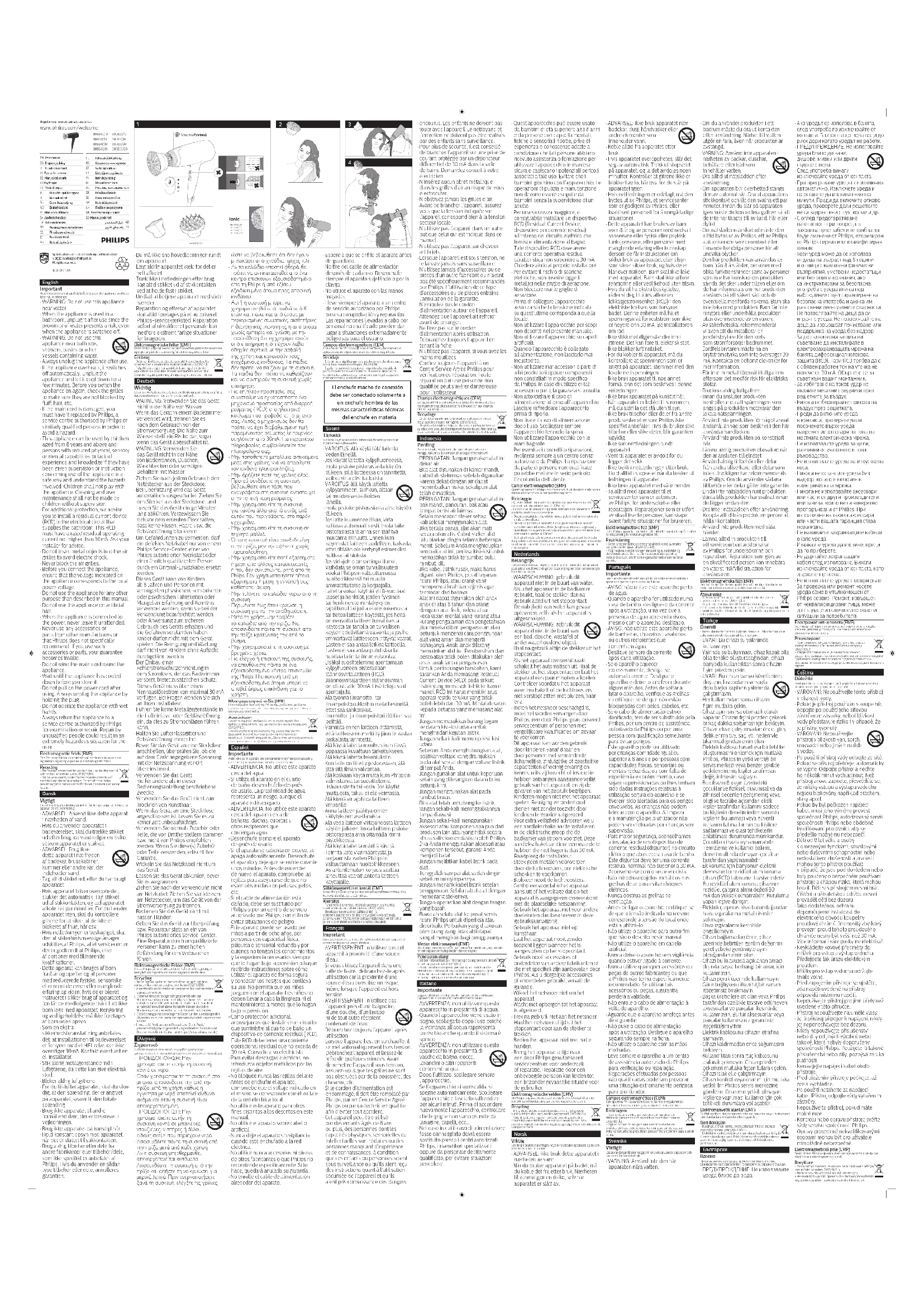 - Conez toujours l’appareil à un Centre Service Agréé Philips pour vérication ou réparation. Toute réparation par une personne non qualiée peut s’avérer dangereuse pour l’utilisateur. Champs électromagnétiques (CEM) Cet appareil Philips est conforme à toutes les normes et à tous les règlements applicables relatifs à l’exposition aux champs électromagnétiques. Recyclage - Ce symbole signie que ce produit ne doit pas être mis au rebut avec les ordures ménagères (2012/19/UE).- Respectez les règles en vigueur dans votre pays pour la mise au rebut des produits électriques et électroniques. Une mise au rebut correcte contribue à préserver l’environnement et la santé. Indonesia Penting Baca petunjuk pengguna ini dengan saksama sebelum menggunakannya dan simpanlah sebagai referensi nanti.• PERINGATAN: Jangan gunakan alat ini dekat air.