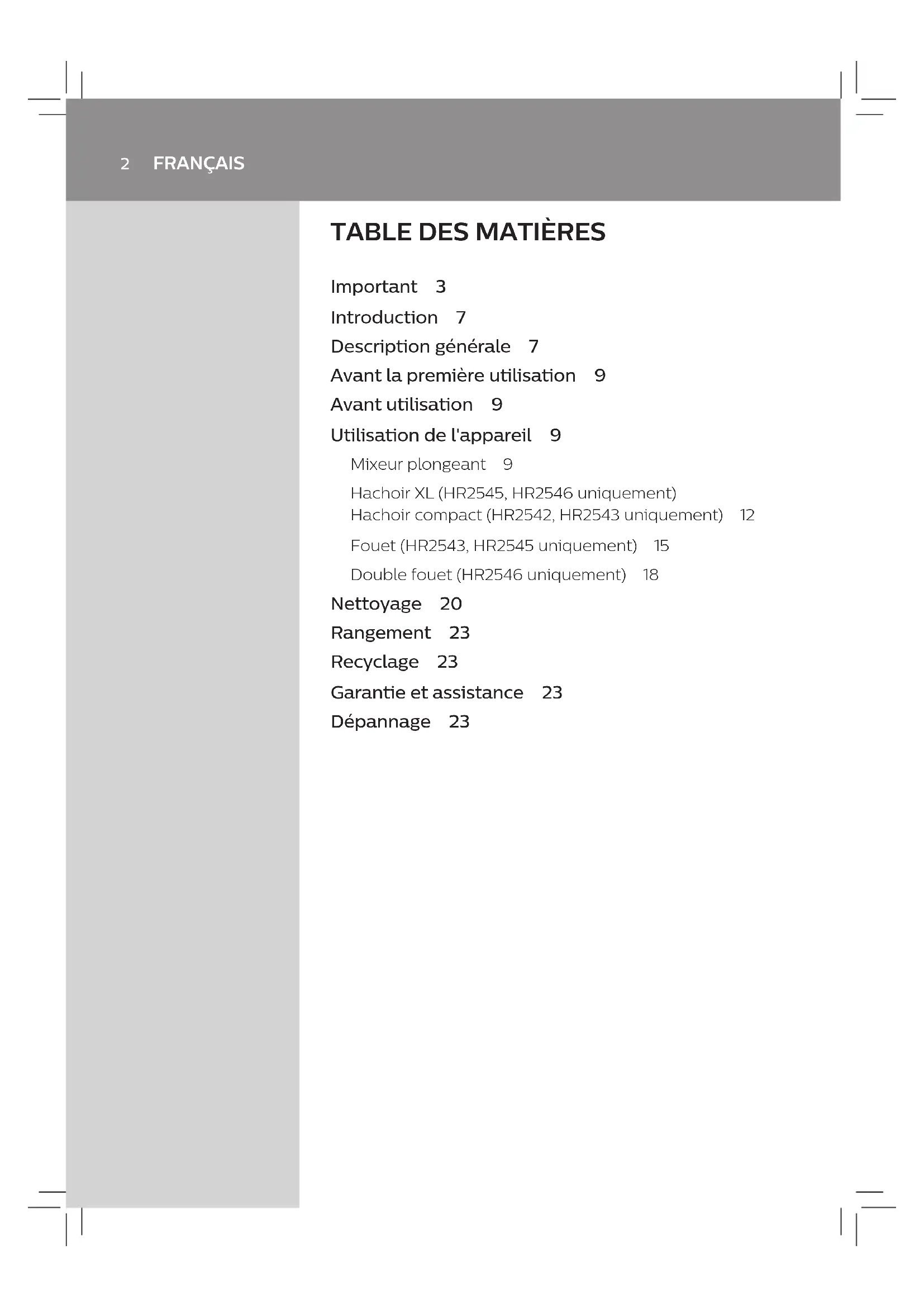 Important 3 Introduction 7 Description générale 7 Avant la première utilisation 9 Avant utilisation 9 Utilisation de l'appareil 9 Mixeur plongeant 9 Hachoir XL (HR2545, HR2546 uniquement) Hachoir compact (HR2542, HR2543 uniquement) 12 Fouet (HR2543, HR2545 uniquement) 15 Double fouet (HR2546 uniquement) 18 Nettoyage 20 Rangement 23 Recyclage 23 Garantie et assistance 23 Dépannage 233 FRANÇAIS Important Lisez attentivement ce mode d'emploi avant d'utiliser l'appareil et conservez-le pour un usage ultérieur. Danger - Ne plongez jamais le bloc moteur dans l'eau, ni dans d'autres liquides et ne le rincez pas. Nettoyez le bloc moteur uniquement avec un chion humide. Avertissement - Avant de brancher l'appareil, vériez que la tension indiquée sur l'appareil correspond à la tension supportée par le secteur local. - N'utilisez jamais l'appareil si la che, le cordon d'alimentation ou d'autres pièces sont endommagées ou présentent des ssures visibles. - Si le cordon d'alimentation est endommagé, il doit être remplacé par Philips, son agent de maintenance ou d'autres personnes disposant des qualications appropriées an d'éviter tout accident. - Ne touchez en aucun cas les lames des ensembles lames, surtout lorsque l'appareil est branché. Les bords sont très coupants. - N'utilisez jamais un ensemble lames de hachoir sans bol de hachoir. - Pour éviter les éclaboussures, immergez toujours le mixeur plongeant, le fouet (certains modèles uniquement) ou le double fouet (certains modèles uniquement) dans les ingrédients avant d'allumer l'appareil, surtout lorsqu'ils sont chauds.4 FRANÇAIS - Si l'un des ensembles lames se bloque, débranchez toujours l'appareil avant de retirer les ingrédients à l'origine du blocage. - Faites attention lorsque vous versez un liquide chaud dans le bol car le liquide chaud et la vapeur peuvent occasionner des brûlures. - Cet appareil est destiné uniquement à un usage domestique normal. Il n'a pas été conçu pour une utilisation dans des environnements tels que des cuisines destinées aux employés dans les entreprises, magasins et autres environnements de travail. Il n'est pas non plus destiné à être utilisé par des clients dans des hôtels, motels, chambres d'hôtes et autres environnements résidentiels. - N'utilisez jamais d'ingrédients durs, tels que des glaçons, avec l'appareil. - Cet appareil ne doit pas être utilisé par des enfants. Tenez l'appareil et son cordon hors de portée des enfants. - Cet appareil peut être utilisé par des personnes dont les capacités physiques, sensorielles ou intellectuelles sont réduites ou des personnes manquant d'expérience et de connaissances, à condition que ces personnes soient sous surveillance ou qu'elles aient reçu des instructions quant à l'utilisation sécurisée de l'appareil et qu'elles aient pris connaissance des dangers encourus. - Les enfants ne doivent pas jouer avec l'appareil.5 FRANÇAIS - Débranchez toujours l'appareil de l'alimentation s'il n'est pas utilisé et avant de l'assembler, de le désassembler, de le ranger ou de le nettoyer. - Avant la première utilisation, nettoyez soigneusement toutes les pièces en contact avec des aliments. Reportez-vous aux instructions et au tableau fournis dans ce manuel. - Débranchez toujours l'appareil de l'alimentation avant de changer les accessoires ou de manipuler des pièces mobiles. Attention - N'utilisez pas l'appareil avec un accessoire pendant plus de 3 minutes sans interruption. Laissez toujours refroidir l'appareil 15 minutes avant de le réutiliser. - Aucun des accessoires n'est adapté pour une utilisation au micro-ondes. - N'utilisez jamais d'accessoires ou de pièces d'un autre fabricant ou n'ayant pas été spéciquement recommandés par Philips. L'utilisation de ce type d'accessoires ou de pièces entraîne l'annulation de la garantie. - Tenez le bloc moteur à l'écart de la chaleur, du feu, de l'humidité et de la saleté. - N'utilisez pas cet appareil à d'autres ns que celles pour lesquelles il a été conçu (voir le mode d'emploi). - Ne remplissez jamais le bol, le bol du hachoir XL (certains modèles uniquement) ou le bol du hachoir compact (certains modèles uniquement) avec des ingrédients dont la température dépasse 80°C.6 FRANÇAIS - Ne dépassez pas les quantités et les temps de préparation indiqués dans le tableau. - Nettoyez l'ensemble lames du mixeur plongeant sous l'eau du robinet. Ne plongez jamais l'unité d'alimentation dans l'eau. - Après le nettoyage, laissez sécher le mixeur plongeant. Rangez-le horizontalement ou avec la lame orientée vers le haut. - Niveau sonore: Lc = 85 dB(A) Champs électromagnétiques (CEM) Cet appareil Philips est conforme à toutes les normes et à tous les règlements applicables relatifs à l'exposition aux champs électromagnétiques.7 FRANÇAIS Introduction Félicitations pour votre achat et bienvenue chez Philips! Pour proter pleinement de l'assistance oerte par Philips, enregistrez votre appareil à l'adresse suivante: www.philips.com/welcome. Description générale Mixeur plongeant 1 Bouton marche/arrêt 2 Bouton TURBO 3 Bloc moteur 4 Bouton de déverrouillage 5 Pied de mixeur avec ensemble lames intégré Fouet (HR2543, HR2545 uniquement) 6 Unité d'assemblage du fouet 7 Fouet Bol mélangeur (HR2541, HR2542, HR2543, HR2545 uniquement) 8 Bol Double fouet (HR2546 uniquement) 9 Unité d'assemblage du double fouet 10 Double fouet Hachoir XL (HR2545, HR2546 uniquement) 11 Couvercle du hachoir grande capacité 12 Ensemble lames du hachoir grande capacité 13 Bol du hachoir grande capacité Hachoir compact (HR2542, HR2543 uniquement) 14 Couvercle du hachoir compact 15 Ensemble lames du hachoir compact 16 Bol du hachoir compact8 FRANÇAIS HR2546 HR2542 HR2543 HR2543 HR2545
