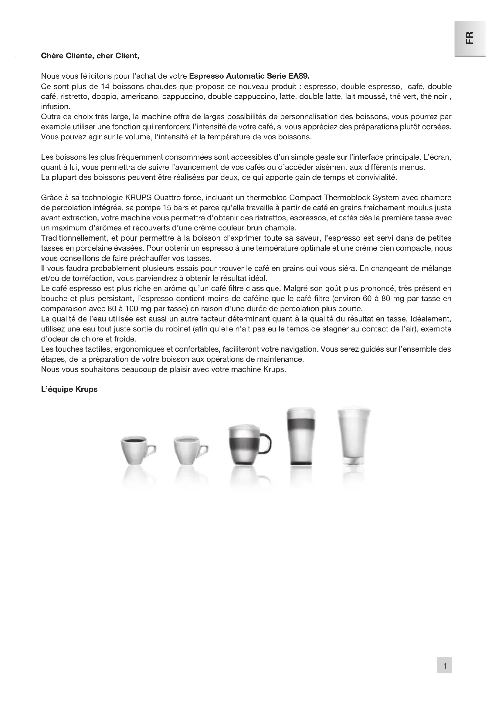 23Chère Cliente, cher Client, Nous vous félicitons pour l’achat de votre Espresso Automatic Serie EA89. Ce sont plus de 14 boissons chaudes que propose ce nouveau produit : espresso, double espresso, café, double café, ristretto, doppio, americano, cappuccino, double cappuccino, latte, double latte, lait moussé, thé vert, thé noir, infusion. Outre ce choix très large, la machine offre de larges possibilités de personnalisation des boissons, vous pourrez par exemple utiliser une fonction qui renforcera l’intensité de votre café, si vous appréciez des préparations plutôt corsées. Vous pouvez agir sur le volume, l’intensité et la température de vos boissons. Les boissons les plus fréquemment consommées sont accessibles d’un simple geste sur l’interface principale. L’écran, quant à lui, vous permettra de suivre l’avancement de vos cafés ou d’accéder aisément aux différents menus. La plupart des boissons peuvent être réalisées par deux, ce qui apporte gain de temps et convivialité. Grâce à sa technologie KRUPS Quattro force, incluant un thermobloc Compact Thermoblock System avec chambre de percolation intégrée, sa pompe 15 bars et parce qu’elle travaille à partir de café en grains fraîchement moulus juste avant extraction, votre machine vous permettra d’obtenir des ristrettos, espressos, et cafés dès la première tasse avec un maximum d’arômes et recouverts d’une crème couleur brun chamois. Traditionnellement, et pour permettre à la boisson d’exprimer toute sa saveur, l’espresso est servi dans de petites tasses en porcelaine évasées. Pour obtenir un espresso à une température optimale et une crème bien compacte, nous vous conseillons de faire préchauffer vos tasses. Il vous faudra probablement plusieurs essais pour trouver le café en grains qui vous siéra. En changeant de mélange et/ou de torréfaction, vous parviendrez à obtenir le résultat idéal. Le café espresso est plus riche en arôme qu’un café ltre classique. Malgré son goût plus prononcé, très présent en bouche et plus persistant, l’espresso contient moins de caféine que le café ltre (environ 60 à 80 mg par tasse en comparaison avec 80 à 100 mg par tasse) en raison d’une durée de percolation plus courte. La qualité de l’eau utilisée est aussi un autre facteur déterminant quant à la qualité du résultat en tasse. Idéalement, utilisez une eau tout juste sortie du robinet (an qu’elle n’ait pas eu le temps de stagner au contact de l’air), exempte d’odeur de chlore et froide. Les touches tactiles, ergonomiques et confortables, faciliteront votre navigation. Vous serez guidés sur l’ensemble des étapes, de la préparation de votre boisson aux opérations de maintenance. Nous vous souhaitons beaucoup de plaisir avec votre machine Krups. L’équipe Krups