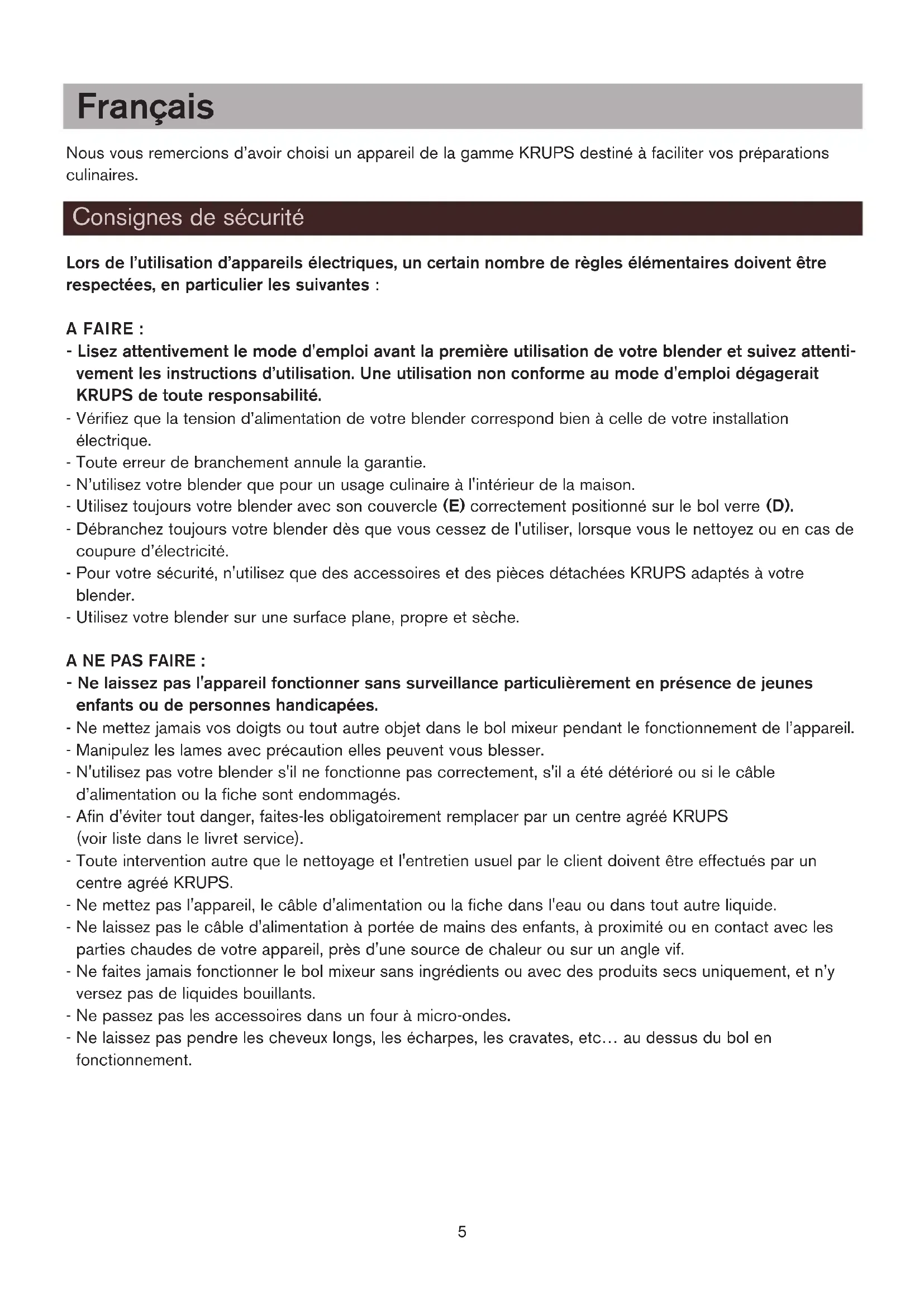 1 oder 2 3 oder 4 5 s kurz Vari Pulse 30 s kurz Vari Pulse kurz Vari Pulse Reinigung Was tun, wenn Ihr Standmixer nicht funktioniert ? Entsorgung Schützen Sie die Umwelt! Ihr Gerät enthält wertvolle, wiederverwertbare Rohstoffe. Bitte geben Sie Ihr Gerät zum Entsorgen nicht in den Hausmüll, sondern bringen Sie es zu einer speziellen Entsorgungsstelle für Elektrokleingeräte (Wertstoffhof). notice* 6/04/06 14:27 Page 4Nous vous remercions d’avoir choisi un appareil de la gamme KRUPS destiné à faciliter vos préparations culinaires. Lors de l’utilisation d’appareils électriques, un certain nombre de règles élémentaires doivent être respectées, en particulier les suivantes : A FAIRE : - Lisez attentivement le mode d'emploi avant la première utilisation de votre blender et suivez attenti- vement les instructions d’utilisation. Une utilisation non conforme au mode d'emploi dégagerait KRUPS de toute responsabilité. - Vérifiez que la tension d’alimentation de votre blender correspond bien à celle de votre installation électrique. - Toute erreur de branchement annule la garantie. - N’utilisez votre blender que pour un usage culinaire à l'intérieur de la maison. - Utilisez toujours votre blender avec son couvercle (E) correctement positionné sur le bol verre (D). - Débranchez toujours votre blender dès que vous cessez de l'utiliser, lorsque vous le nettoyez ou en cas de coupure d’électricité. - Pour votre sécurité, n'utilisez que des accessoires et des pièces détachées KRUPS adaptés à votre blender. - Utilisez votre blender sur une surface plane, propre et sèche. A NE PAS FAIRE : - Ne laissez pas l'appareil fonctionner sans surveillance particulièrement en présence de jeunes enfants ou de personnes handicapées. - Ne mettez jamais vos doigts ou tout autre objet dans le bol mixeur pendant le fonctionnement de l’appareil. - Manipulez les lames avec précaution elles peuvent vous blesser. - N'utilisez pas votre blender s'il ne fonctionne pas correctement, s'il a été détérioré ou si le câble d’alimentation ou la fiche sont endommagés. - Afin d'éviter tout danger, faites-les obligatoirement remplacer par un centre agréé KRUPS (voir liste dans le livret service). - Toute intervention autre que le nettoyage et l'entretien usuel par le client doivent être effectués par un centre agréé KRUPS. - Ne mettez pas l'appareil, le câble d'alimentation ou la fiche dans l'eau ou dans tout autre liquide. - Ne laissez pas le câble d'alimentation à portée de mains des enfants, à proximité ou en contact avec les parties chaudes de votre appareil, près d'une source de chaleur ou sur un angle vif. - Ne faites jamais fonctionner le bol mixeur sans ingrédients ou avec des produits secs uniquement, et n’y versez pas de liquides bouillants. - Ne passez pas les accessoires dans un four à micro-ondes. - Ne laissez pas pendre les cheveux longs, les écharpes, les cravates, etc… au dessus du bol en fonctionnement. Consignes de sécurité Français