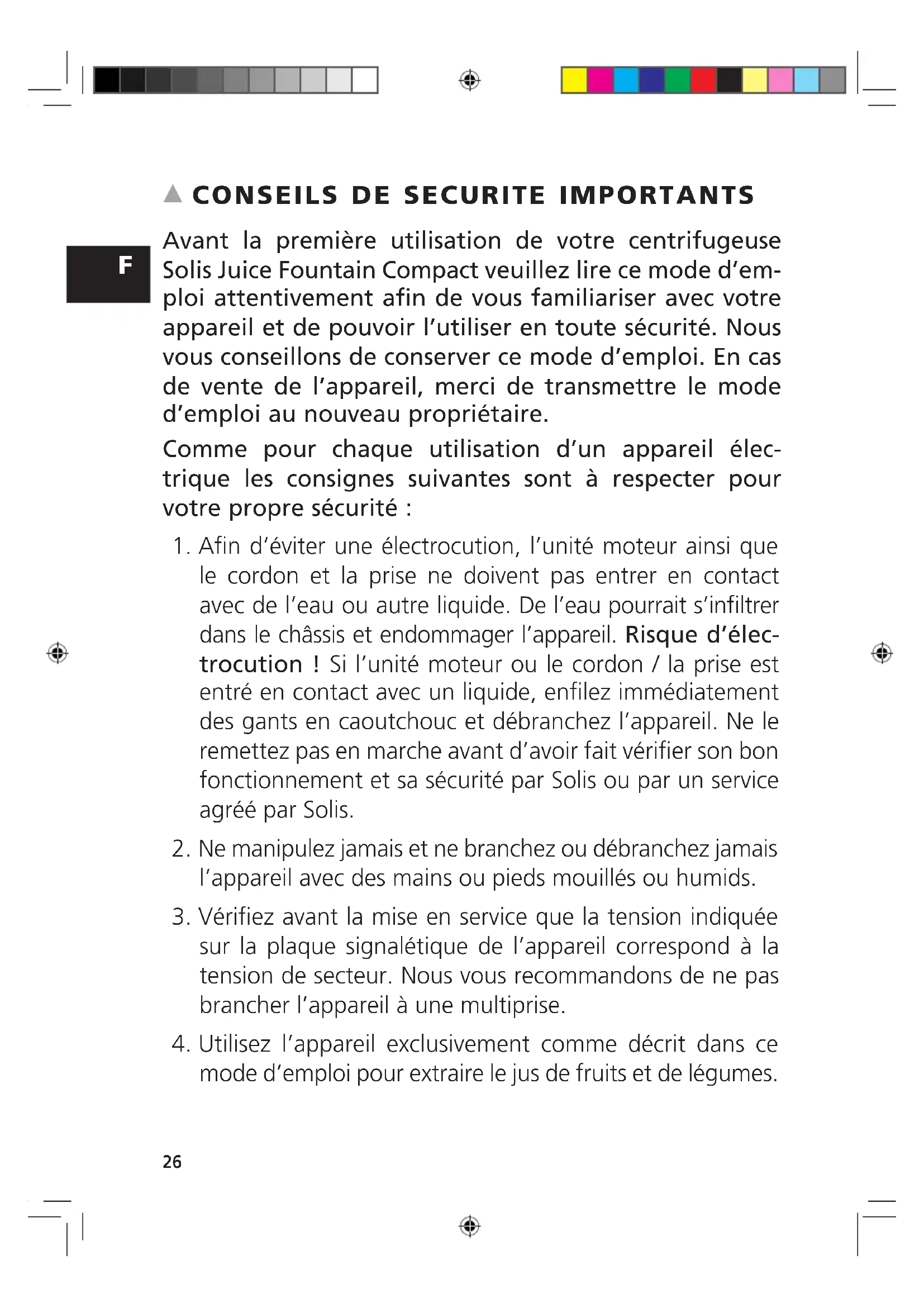 Avant la première utilisation de votre centrifugeuse Solis Juice Fountain Compact veuillez lire ce mode d’em- ploi attentivement afin de vous familiariser avec votre appareil et de pouvoir l’utiliser en toute sécurité. Nous vous conseillons de conserver ce mode d’emploi. En cas de vente de l’appareil, merci de transmettre le mode d’emploi au nouveau propriétaire. Comme pour chaque utilisation d’un appareil élec- trique les consignes suivantes sont à respecter pour votre propre sécurité :