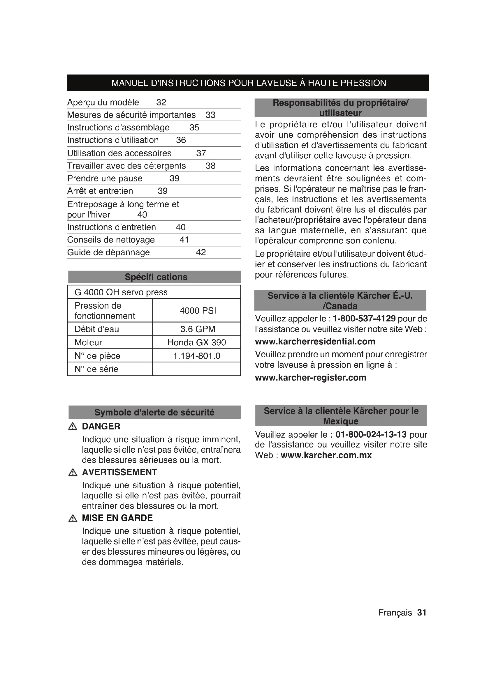 Indique une situation à risque potentiel, laquelle si elle n’est pas évitée, peut caus- er des blessures mineures ou légères, ou des dommages matériels. Le propriétaire et/ou l'utilisateur doivent avoir une compréhension des instructions d'utilisation et d'avertissements du fabricant avant d'utiliser cette laveuse à pression. Les informations concernant les avertisse- ments devraient être soulignées et com- prises. Si l'opérateur ne maîtrise pas le fran- çais, les instructions et les avertissements du fabricant doivent être lus et discutés par l'acheteur/propriétaire avec l'opérateur dans sa langue maternelle, en s'assurant que l'opérateur comprenne son contenu. Le propriétaire et/ou l'utilisateur doivent étud- ier et conserver les instructions du fabricant pour références futures. Veuillez appeler le : 1-800-537-4129 pour de l'assistance ou veuillez visiter notre site Web : www.karcherresidential.com Veuillez prendre un moment pour enregistrer votre laveuse à pression en ligne à : www.karcher-register.com Veuillez appeler le : 01-800-024-13-13 pour de l'assistance ou veuillez visiter notre site Web : www.karcher.com.mx Responsabilités du propriétaire/ utilisateur Symbole d'alerte de sécurité Service à la clientèle Kärcher É.-U. /Canada Service à la clientèle Kärcher pour le Mexique G 4000 OH servo press Pression de fonctionnement 4000 PSI Débit d'eau 3.6 GPM Moteur Honda GX 390 N° de pièce 1.194-801.0 N° de série32 Français 1 Poignée 2 Poignée-pistolet 3 Verrouillage de sécurité de la poignée- pistolet 4 Tuyau à haute pression 5 Réservoir à essence 6 Lance 7 Jauge à huile 8 Entrée d'eau avec raccord pour tuyau d'arrosage