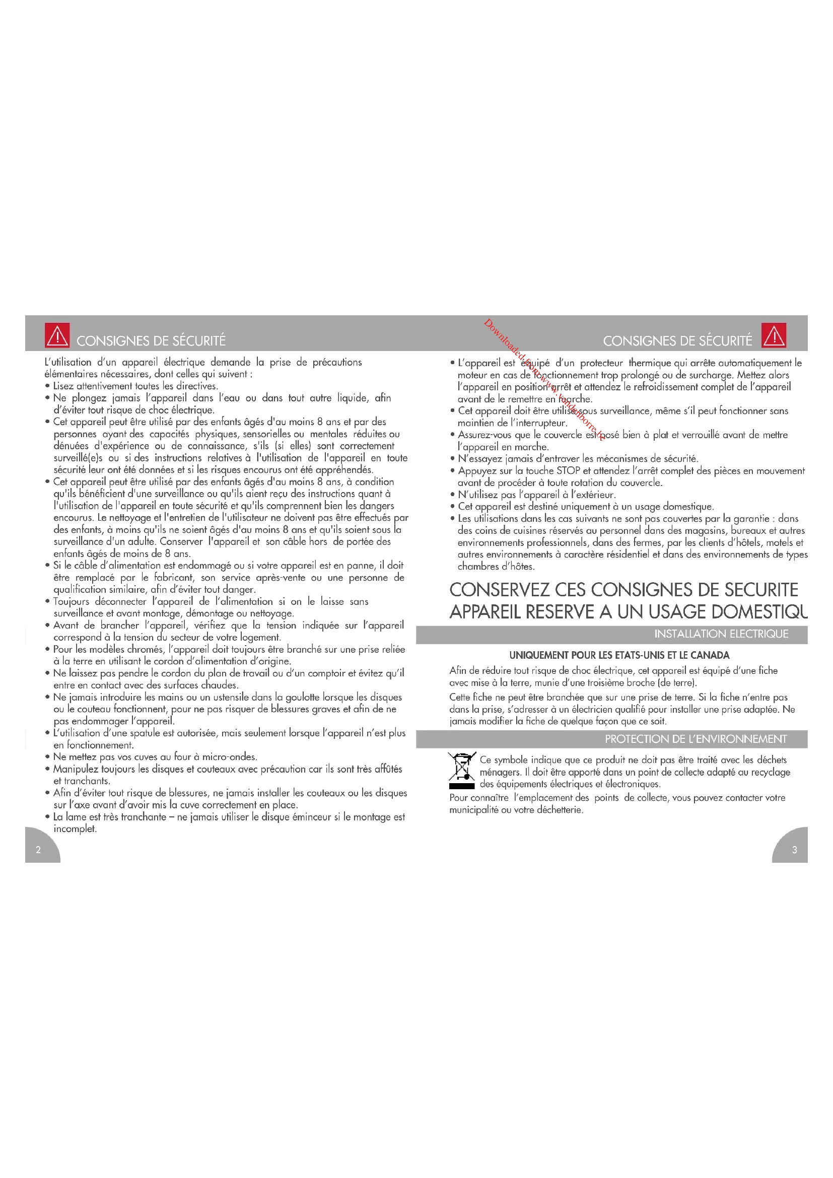 L’utilisation d’un appareil électrique demande la prise de précautions élémentaires nécessaires, dont celles qui suivent :• Lisez attentivement toutes les directives.• Ne plongez jamais l’appareil dans l’eau ou dans tout autre liquide, afin d’éviter tout risque de choc électrique.• Cet appareil peut être utilisé par des enfants âgés d'au moins 8 ans et par des personnes ayant des capacités physiques, sensorielles ou mentales réduites oudénuées d'expérience ou de connaissance, s'ils (si elles) sont correctement surveillé(e)s ou si des instructions relatives à l'utilisation de l'appareil en toute sécurité leur ont été données et si les risques encourus ont été appréhendés.• Cet appareil peut être utilisé par des enfants âgés d'au moins 8 ans, à conditionqu'ils bénéficient d'une surveillance ou qu'ils aient reçu des instructions quant àl'utilisation de l'appareil en toute sécurité et qu'ils comprennent bien les dangersencourus. Le nettoyage et l'entretien de l'utilisateur ne doivent pas être effectués pardes enfants, à moins qu'ils ne soient âgés d'au moins 8 ans et qu'ils soient sous lasurveillance d'un adulte. Conserver l'appareil et son câble hors de portée desenfants âgés de moins de 8 ans. • Si le câble d’alimentation est endommagé ou si votre appareil est en panne, il doitêtre remplacé par le fabricant, son service après-vente ou une personne de qualification similaire, afin d’éviter tout danger.• Toujours déconnecter l’appareil de l’alimentation si on le laisse sans surveillance et avant montage, démontage ou nettoyage.• Avant de brancher l’appareil, vérifiez que la tension indiquée sur l’appareil correspond à la tension du secteur de votre logement.• Pour les modèles chromés, l’appareil doit toujours être branché sur une prise reliéeà la terre en utilisant le cordon d’alimentation d’origine.• Ne laissez pas pendre le cordon du plan de travail ou d’un comptoir et évitez qu’ilentre en contact avec des surfaces chaudes.• Ne jamais introduire les mains ou un ustensile dans la goulotte lorsque les disquesou le couteau fonctionnent, pour ne pas risquer de blessures graves et afin de nepas endommager l’appareil.• L’utilisation d’une spatule est autorisée, mais seulement lorsque l’appareil n’est plusen fonctionnement.• Ne mettez pas vos cuves au four à micro-ondes.• Manipulez toujours les disques et couteaux avec précaution car ils sont très affûtéset tranchants.• Afin d’éviter tout risque de blessures, ne jamais installer les couteaux ou les disquessur l’axe avant d’avoir mis la cuve correctement en place.• La lame est très tranchante – ne jamais utiliser le disque éminceur si le montage estincomplet.• L’appareil est équipé d’un protecteur thermique qui arrête automatiquement lemoteur en cas de fonctionnement trop prolongé ou de surcharge. Mettez alorsl’appareil en position arrêt et attendez le refroidissement complet de l’appareilavant de le remettre en marche.• Cet appareil doit être utilisé sous surveillance, même s’il peut fonctionner sansmaintien de l’interrupteur.