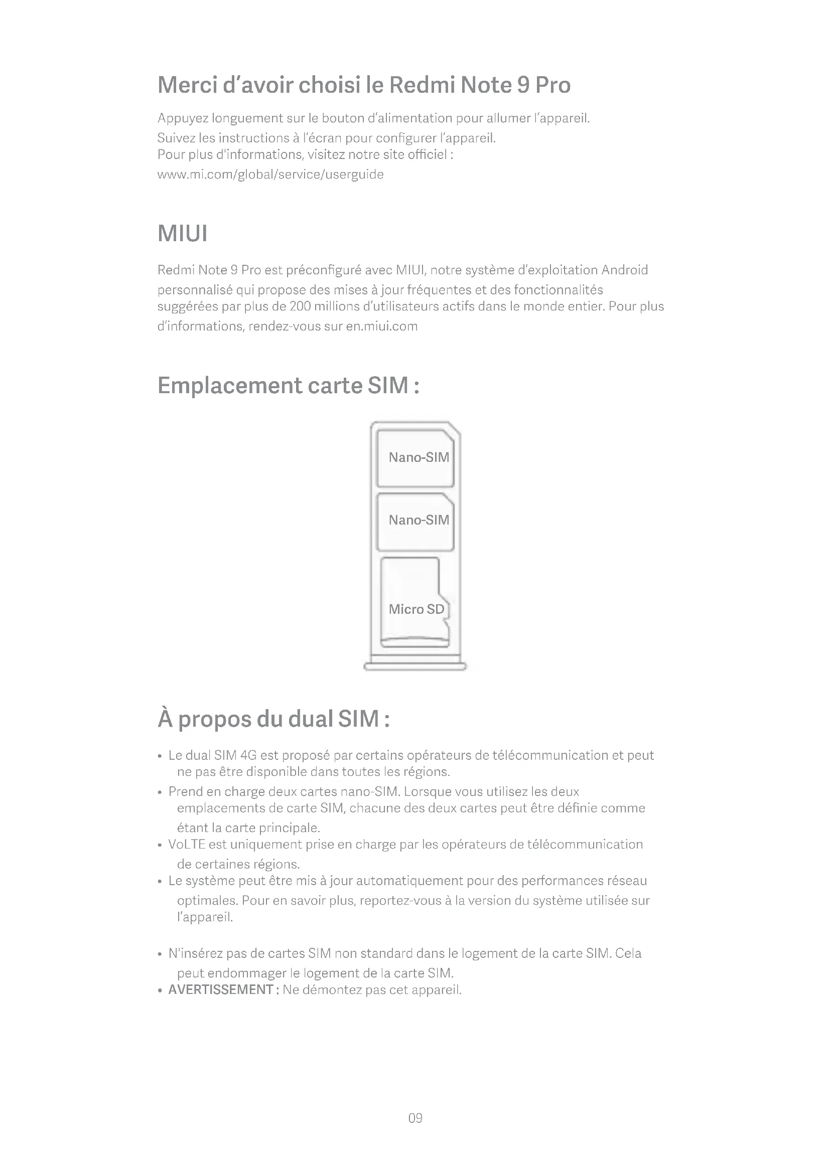 08Merci d’avoir choisi le Redmi Note 9 Pro Appuyez longuement sur le bouton d’alimentation pour allumer l’appareil. Suivez les instructions à l’écran pour configurer l’appareil. Pour plus d'informations, visitez notre site officiel : www.mi.com/global/service/userguide MIUI Redmi Note 9 Pro est préconfiguré avec MIUI, notre système d’exploitation Android personnalisé qui propose des mises à jour fréquentes et des fonctionnalités suggérées par plus de 200 millions d’utilisateurs actifs dans le monde entier. Pour plus d’informations, rendez-vous sur en.miui.com Emplacement carte SIM : Micro SD Nano-SIM Nano-SIM À propos du dual SIM :