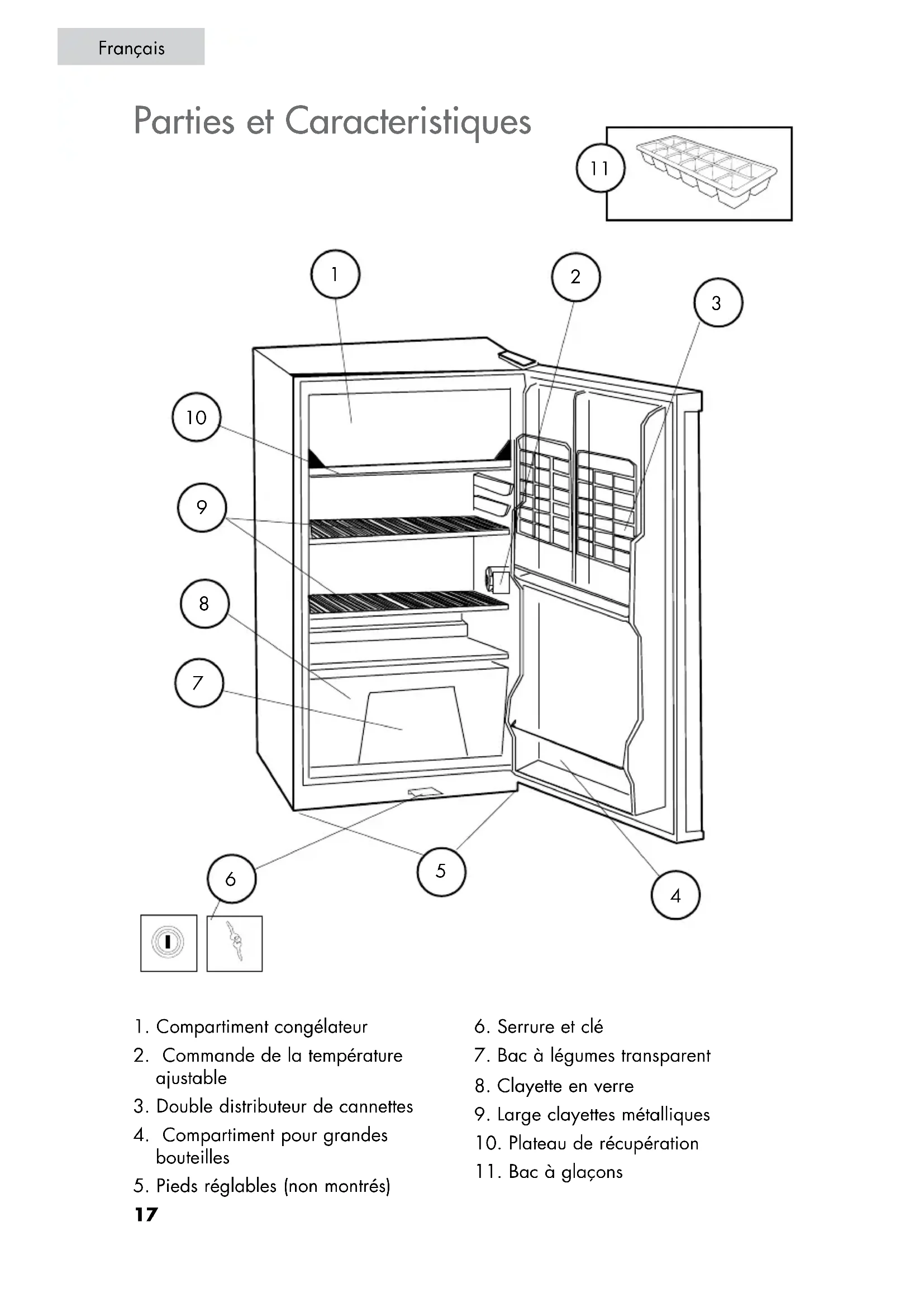 - Lethermostatcliqueteraquandilsemetenmarche(ON)ets’eteint (OFF). fig. 7 plateau d’égouttement Entretien et Nettoyage du Refrigerateur Avertissements: Afin d’eviter les risques des shocs electriques, debranchez toujours votre refrigerateur avant de le nettoyer. En ignorant cet avertissement, des blessures graves ou meme un deces peuvent occurer . Attention: Avant d’utiliser des produits de nettoyage, veuillez lire et respecter les instructions et avertissements du fabrican afin d’eviter des dommages a l’appareil ou des blessures personnelles.Français
