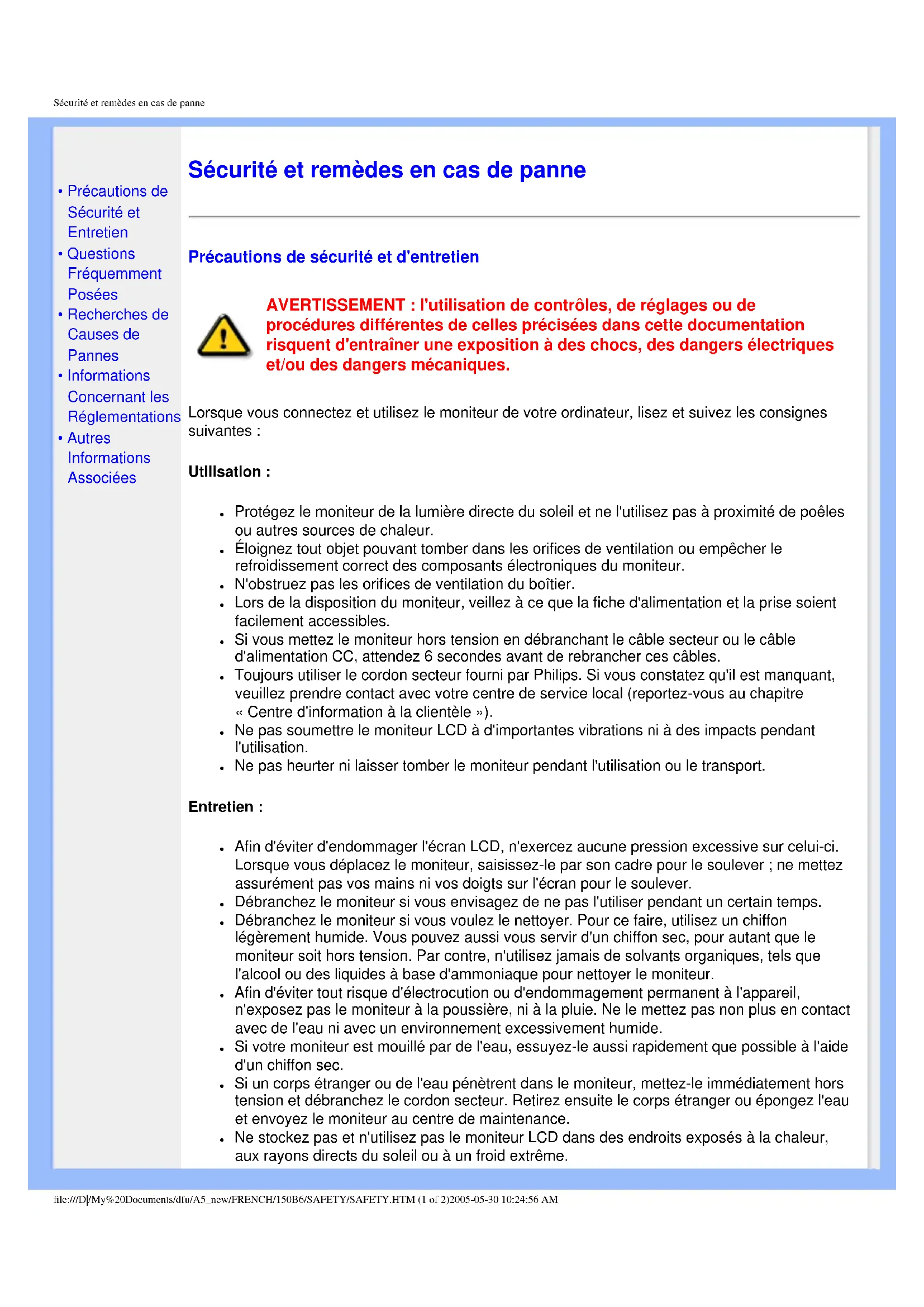 file:///D|/My%20Documents/dfu/A5_new/FRENCH/150B6/SAFETY/SAFETY.HTM (1 of 2)2005-05-30 10:24:56 AMSécurité et remèdes en cas de panne ● Afin d'assurer les performances optimales de votre moniteur et l'utiliser pendant plus longtemps, il doit se trouver dans un endroit compris dans les plages de température et d'humidité suivantes : ❍ Température : 5-40°C ❍ Humidité : 20-80% HR Service après-vente : ● Le boîtier peut uniquement être ouvert par un technicien qualifié. ● Si vous avez besoin de documents en vue d'une réparation, veuillez prendre contact avec votre centre de service local (reportez-vous à la section « Centre d'information à la clientèle ») . ● Pour toute information relative au transport, consultez les « Caractéristiques physiques ». ● Ne laissez pas votre moniteur dans une voiture ni dans un coffre de voiture à la lumière directe du soleil. Adressez-vous à un technicien si le moniteur ne fonctionne pas normalement ou si vous n'êtes pas sûr(e) de la procédure à suivre après avoir lu les instructions du mode d'emploi.