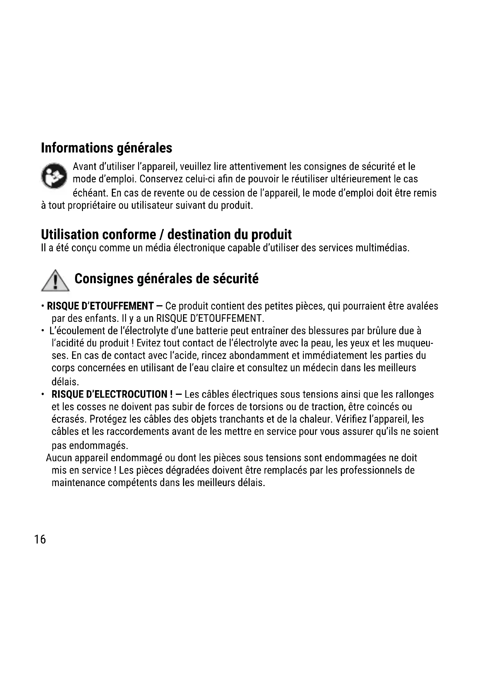 360° 360° F16 Informations générales Avant d’utiliser l’appareil, veuillez lire attentivement les consignes de sécurité et le mode d’emploi. Conservez celui-ci an de pouvoir le réutiliser ultérieurement le cas échéant. En cas de revente ou de cession de l’appareil, le mode d’emploi doit être remis à tout propriétaire ou utilisateur suivant du produit. Utilisation conforme / destination du produit Il a été conçu comme un média électronique capable d’utiliser des services multimédias. Consignes générales de sécurité