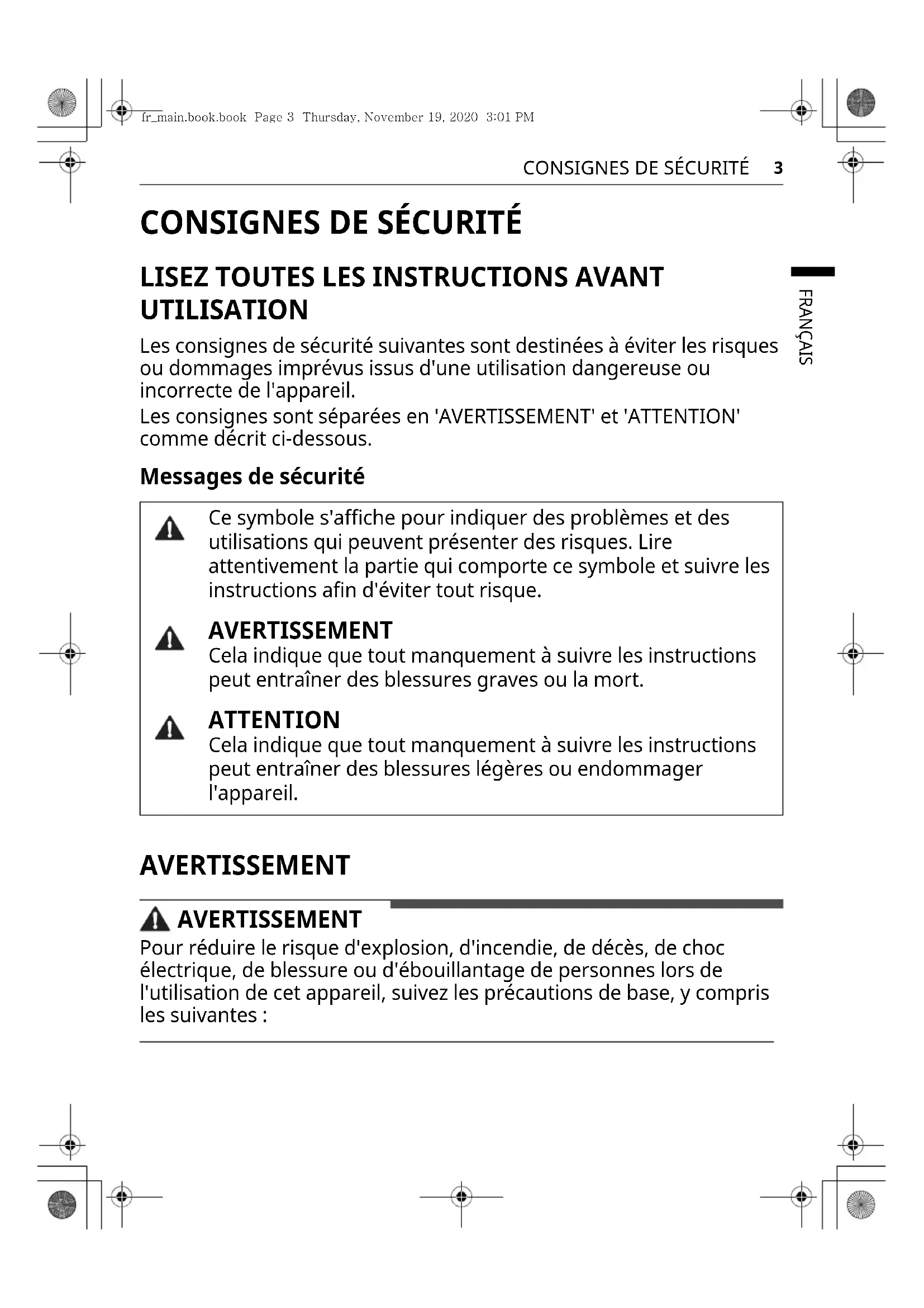 UTILISATION Les consignes de sécurité suivantes sont destinées à éviter les risques ou dommages imprévus issus d'une utilisation dangereuse ou incorrecte de l'appareil. Les consignes sont séparées en 'AVERTISSEMENT' et 'ATTENTION' comme décrit ci-dessous. Messages de sécurité AVERTISSEMENT AVERTISSEMENT Pour réduire le risque d'explosion, d'incendie, de décès, de choc électrique, de blessure ou d'ébouillantage de personnes lors de l'utilisation de cet appareil, suivez les précautions de base, y compris les suivantes : Ce symbole s'affiche pour indiquer des problèmes et des utilisations qui peuvent présenter des risques. Lire attentivement la partie qui comporte ce symbole et suivre les instructions afin d'éviter tout risque. AVERTISSEMENT Cela indique que tout manquement à suivre les instructions peut entraîner des blessures graves ou la mort. ATTENTION Cela indique que tout manquement à suivre les instructions peut entraîner des blessures légères ou endommager l'appareil. fr_main.book.book Page 3 Thursday, November 19, 2020 3:01 PM4