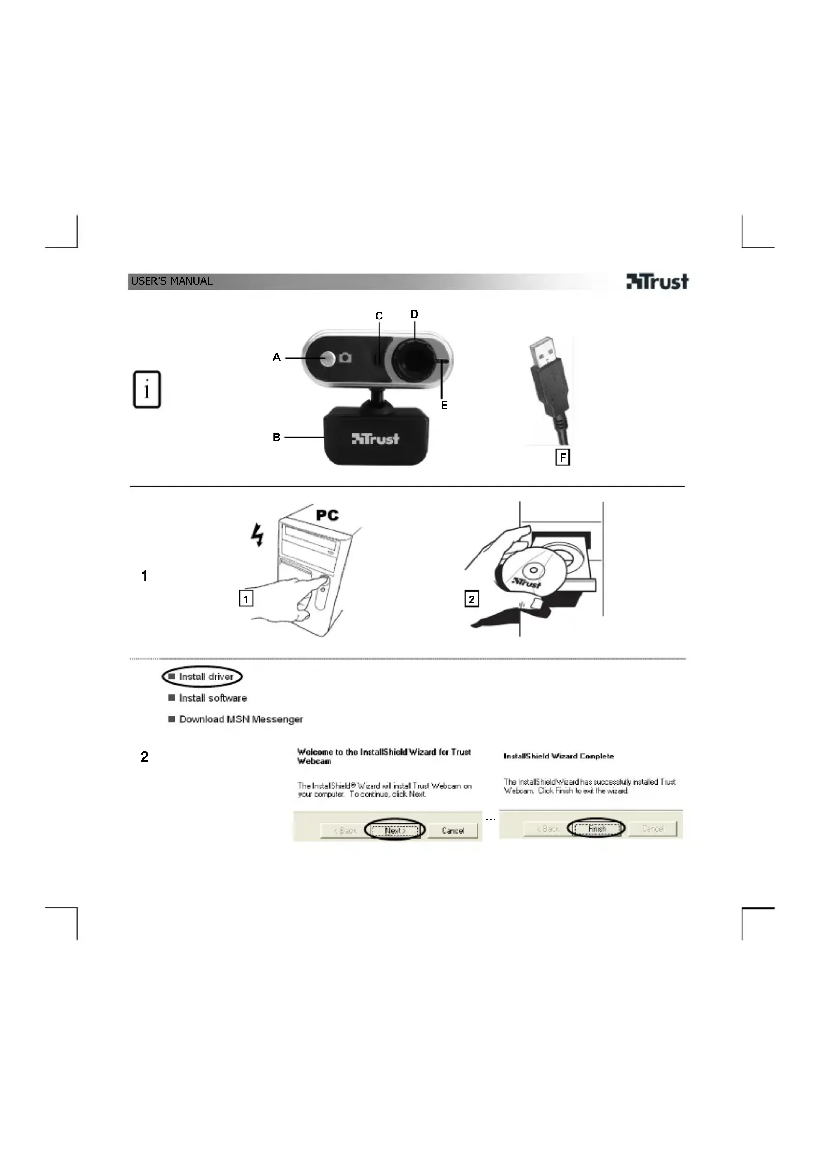 Informations sur les produits A : bouton instantané (Snapshot button) B : fixation polyvalente C : microphone D : bague d’objectif réglable E : témoin d’état F : câble USB Installation 1 (1) PC allumé. (2) Insérez le CD dans le lecteur de CD-ROM. 2 Installez le pilote. Suivez les instructions à l'écran. 3 Positionnez la caméra. Connectez la fiche USB. 4 Attendez que Windows achève automatiquement l’installation.