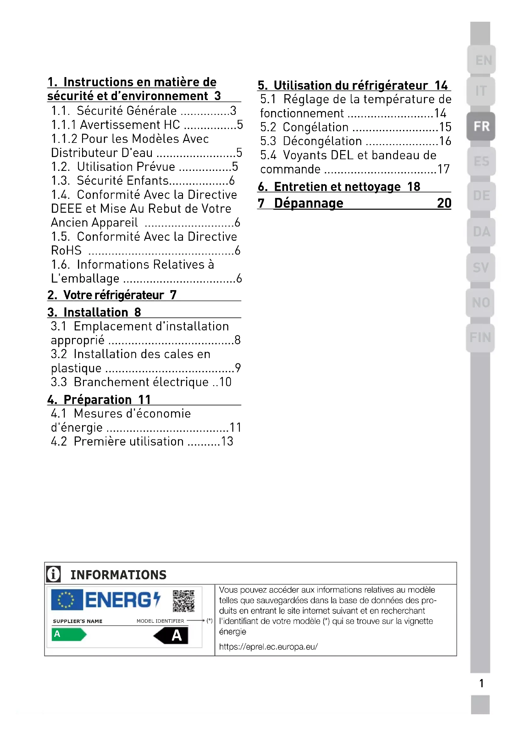7 Dépannage 20 INFORMATIONS Vous pouvez accéder aux informations relatives au modèle telles que sauvegardées dans la base de données des pro-duits en entrant le site internet suivant et en recherchant l'identifiant de votre modèle (*) qui se trouve sur la vignette énergiehttps://eprel.ec.europa.eu/