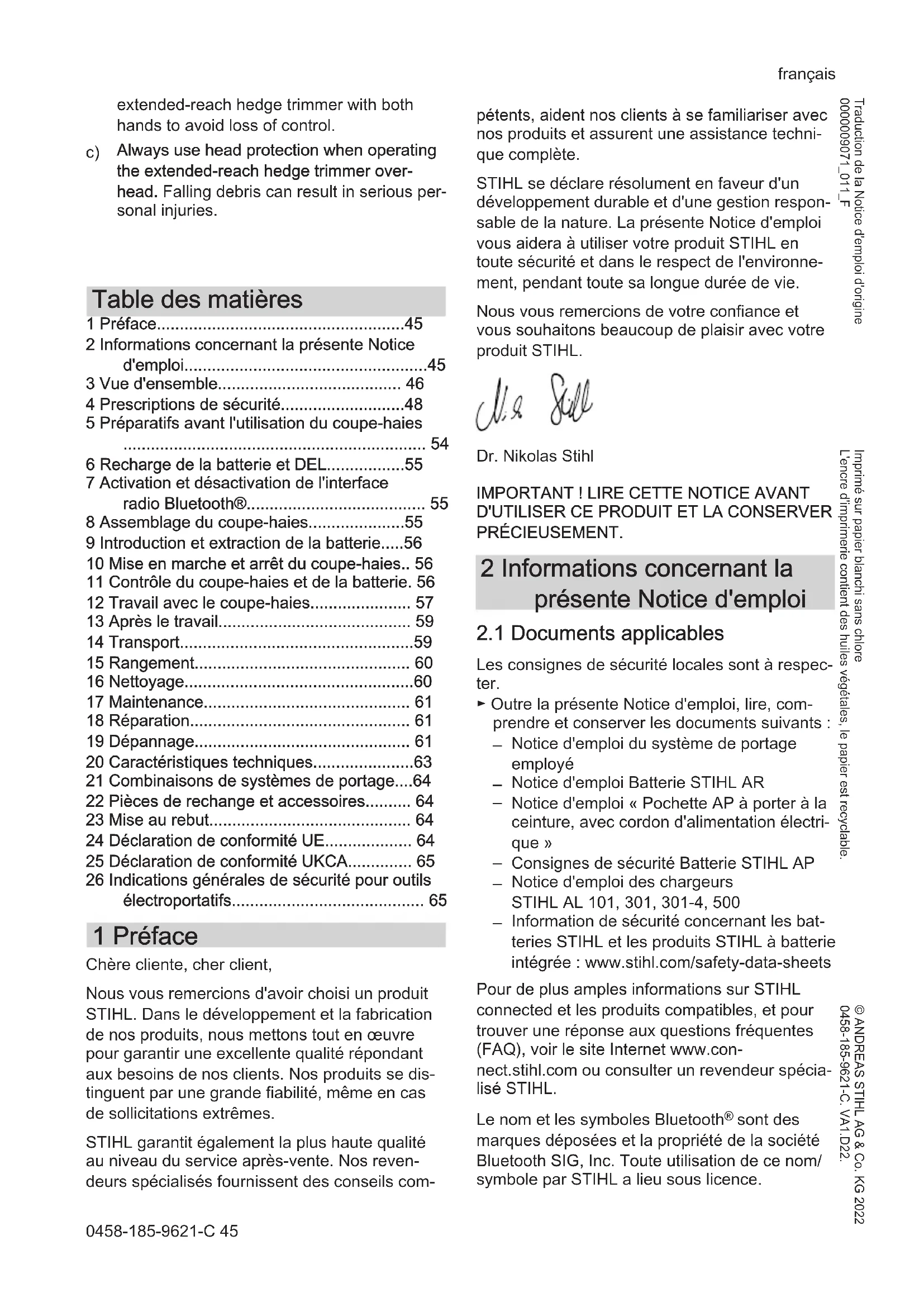 - 26 Indications générales de sécurité pour outils électroportatifs 1 Préface Chère cliente, cher client, Nous vous remercions d'avoir choisi un produit STIHL. Dans le développement et la fabrication de nos produits, nous mettons tout en œuvre pour garantir une excellente qualité répondant aux besoins de nos clients. Nos produits se dis‐ tinguent par une grande fiabilité, même en cas de sollicitations extrêmes. STIHL garantit également la plus haute qualité au niveau du service après-vente. Nos reven‐ deurs spécialisés fournissent des conseils com‐ pétents, aident nos clients à se familiariser avec nos produits et assurent une assistance techni‐ que complète. STIHL se déclare résolument en faveur d'un développement durable et d'une gestion respon‐ sable de la nature. La présente Notice d'emploi vous aidera à utiliser votre produit STIHL en toute sécurité et dans le respect de l'environne‐ ment, pendant toute sa longue durée de vie. Nous vous remercions de votre confiance et vous souhaitons beaucoup de plaisir avec votre produit STIHL. Dr. Nikolas Stihl p. 65