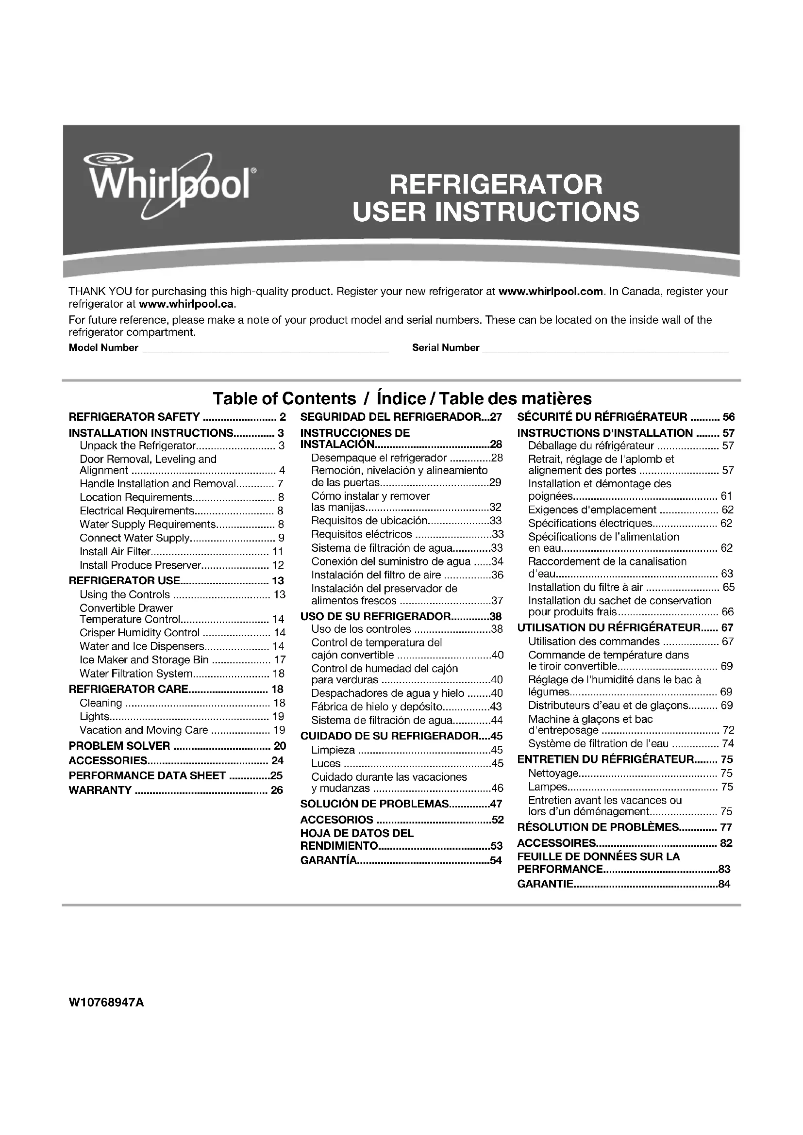 originaux ont été enlevés, modifiés ou ne peuvent pas être facilement identifiés. Le coût d’une réparation ou d’un remplacement dans le cadre de ces circonstances exclues est à la charge du client.8585 12/14 CLAUSE D'EXONÉRATION DE RESPONSABILITÉ AU TITRE DES GARANTIES IMPLICITES LES GARANTIES IMPLICITES, Y COMPRIS LES GARANTIES APPLICABLES DE QUALITÉ MARCHANDE OU D'APTITUDE À UN USAGE PARTICULIER, SONT LIMITÉES À UN AN OU À LA PLUS COURTE PÉRIODE AUTORISÉE PAR LA LOI. Certains États et provinces ne permettent pas de limitation sur la durée des garanties implicites de qualité marchande ou d'aptitude à un usage particulier, de sorte que la limitation ci-dessus peut ne pas être applicable dans votre cas. Cette garantie vous confère des droits juridiques spécifiques et vous pouvez également jouir d’autres droits qui peuvent varier d’une juridiction à l'autre. EXONÉRATION DE RESPONSABILITÉ DANS LES DOMAINES NON COUVERTS PAR LA GARANTIE Whirlpool décline toute responsabilité au titre de la qualité, de la durabilité ou en cas de dépannage ou de réparation nécessaire sur ce gros appareil ménager autre que les responsabilités énoncées dans la présente garantie. Si vous souhaitez une garantie plus étendue ou plus complète que la garantie limitée fournie avec ce gros appareil ménager, adressez-vous à Whirlpool ou à votre détaillant pour obtenir les modalités d'achat d'une garantie étendue. LIMITATION DES RECOURS; EXCLUSION DES DOMMAGES FORTUITS OU INDIRECTS LE SEUL ET EXCLUSIF RECOURS DU CLIENT DANS LE CADRE DE LA PRÉSENTE GARANTIE LIMITÉE CONSISTE EN LA RÉPARATION PRÉVUE PAR LA PRÉSENTE. WHIRLPOOL N’ASSUME AUCUNE RESPONSABILITÉ POUR LES DOMMAGES FORTUITS OU INDIRECTS. Certains États et certaines provinces ne permettent pas l’exclusion ou la limitation des dommages fortuits ou indirects de sorte que ces limitations et exclusions peuvent ne pas être applicables dans votre cas. Cette garantie vous confère des droits juridiques spécifiques et vous pouvez également jouir d’autres droits qui peuvent varier d’une juridiction à l'autre.868686868686 Notes878787878787 NotesW10768947A EN/FR PN W10768948A