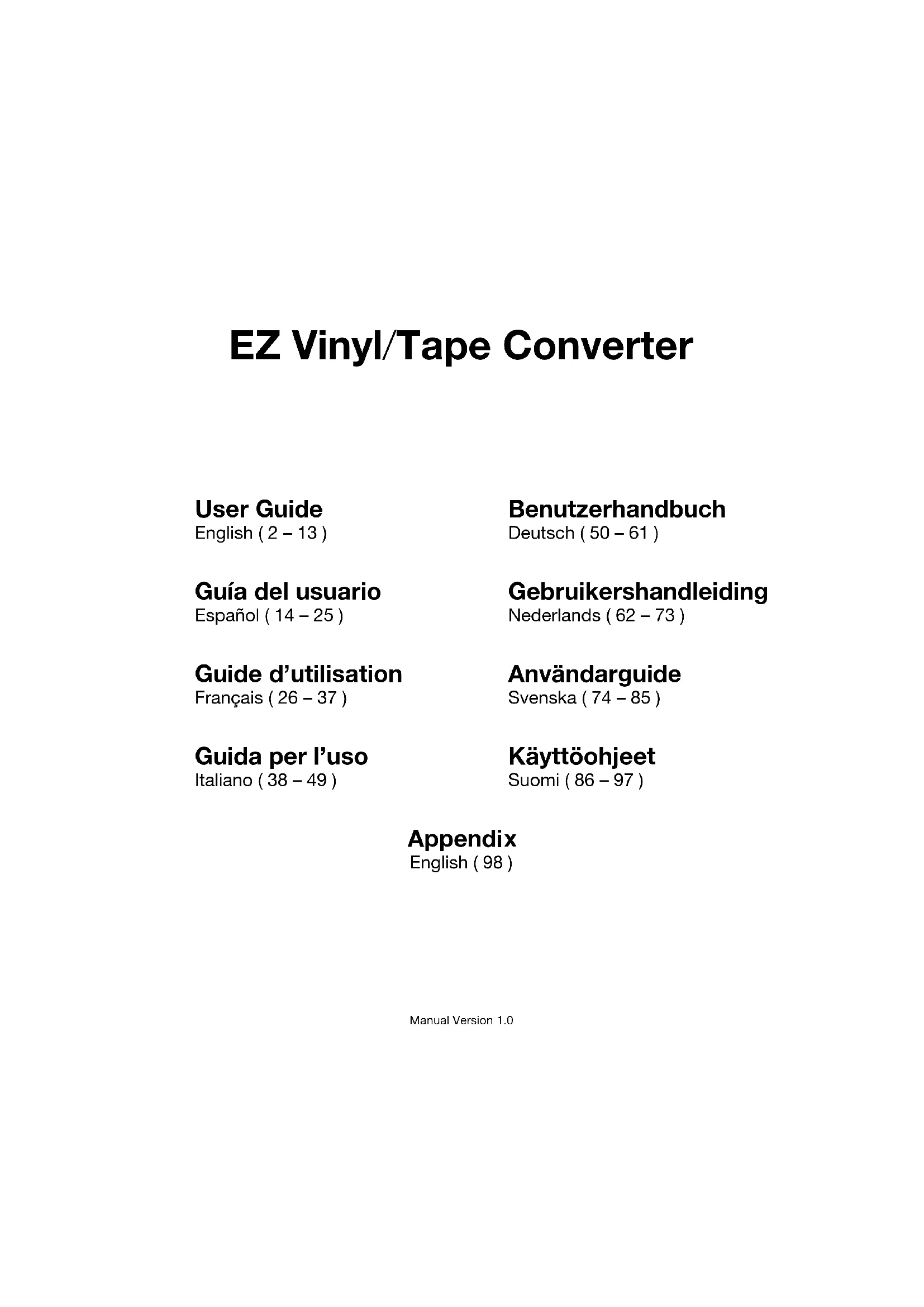 Guide d’utilisation (Français) Présentation Voici l’EZ Vinyl/Tape Converter — la façon la plus facile de transférer vos enregistrements à votre ordinateur. Ce logiciel vous permet de graver vos enregistrements sur CD ou de les transférer sur tout appareil numérique portable. Nous espérons sincèrement que ce produit vous procure autant d’amusement que nous avons eu à le créé pour vous.