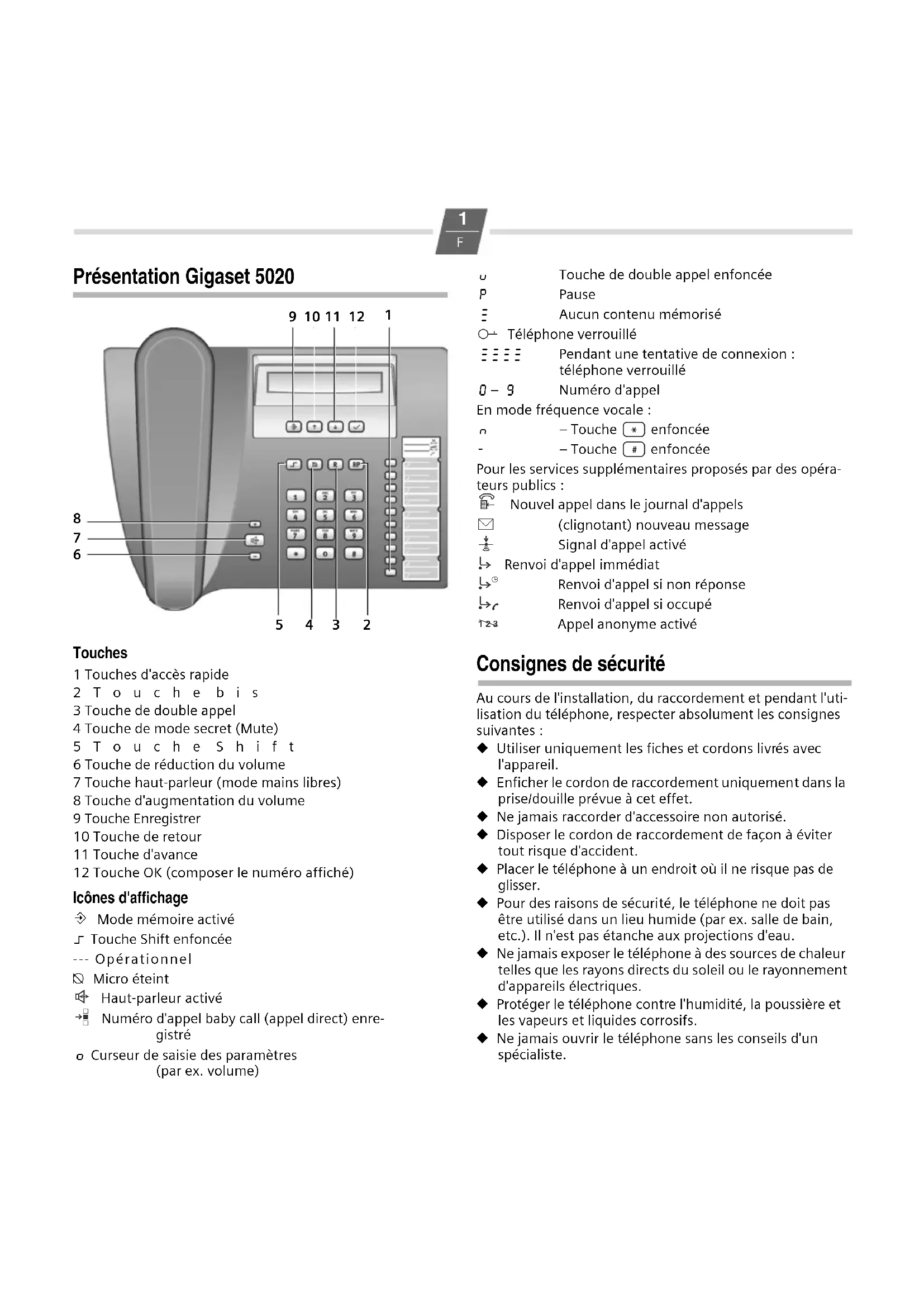Présentation Gigaset 5020 Touches1 Touches d'accès rapide2Touche bis3 Touche de double appel4 Touche de mode secret (Mute)5Touche Shift6 Touche de réduction du volume7 Touche haut-parleur (mode mains libres)8 Touche d'augmentation du volume9 Touche Enregistrer10 Touche de retour11 Touche d'avance12 Touche OK (composer le numéro affiché)Icônes d'affichage P Mode mémoire activé ‡ Touche Shift enfoncée--- Opérationnel y Micro éteint } Haut-parleur activé è Numéro d'appel baby call (appel direct) enre- gistréo Curseur de saisie des paramètres (par ex. volume) Touche de double appel enfoncée Pause Aucun contenu mémorisé { Téléphone verrouillé zzzz Pendant une tentative de connexion : téléphone verrouillé