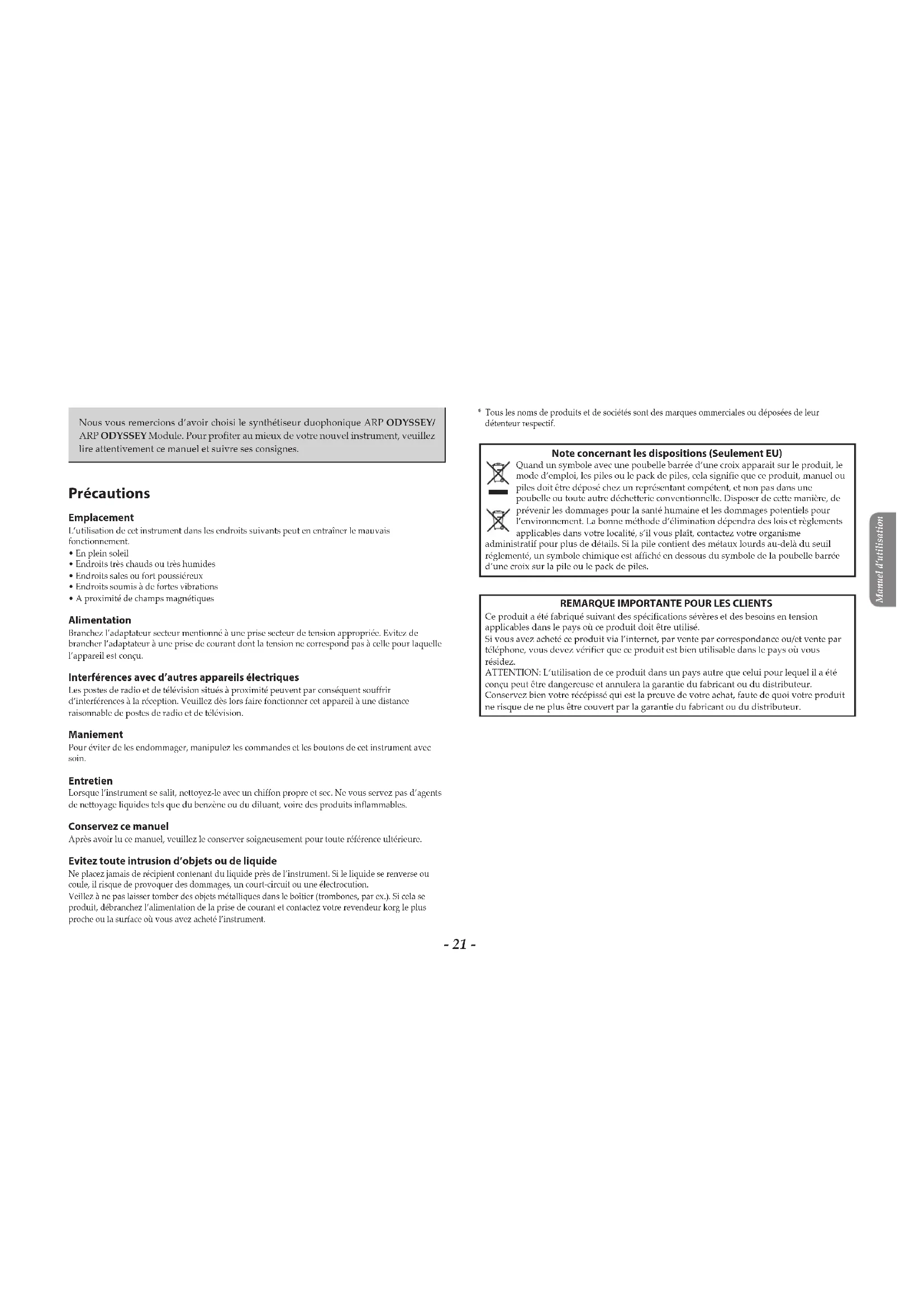 - Specifications and appearance are subject to change without notice for mprovement.- 21 - Manuel d’utilisation Nous vous remercions d’avoir choisi le synthétiseur duophonique ARP ODYSSEY/ ARP ODYSSEY Module. Pour profiter au mieux de votre nouvel instrument, veuillez lire attentivement ce manuel et suivre ses consignes. Précautions Emplacement L’utilisation de cet instrument dans les endroits suivants peut en entraîner le mauvais fonctionnement.