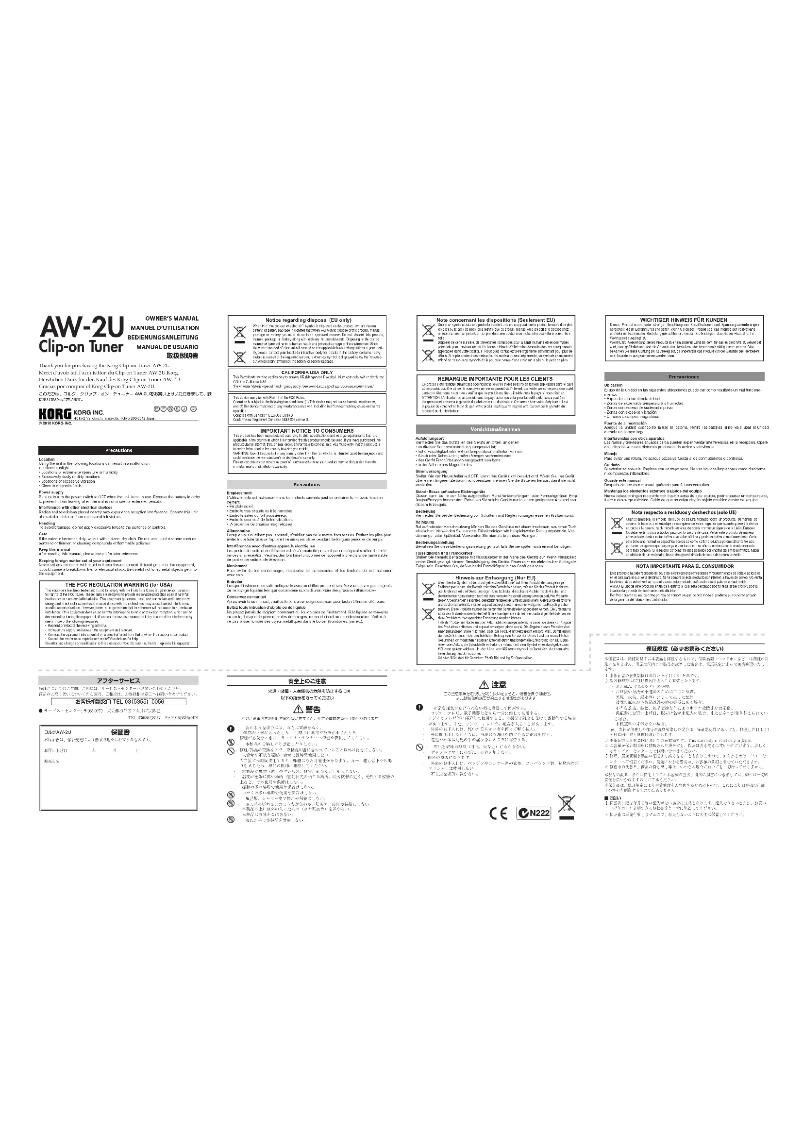 Pouréchangerlapositiondeladouille(A)dujointduclipaveccelleducache(B),il fautextrairelapartieencaoutchouc(C)situéeàl’intérieur.Aprèsl’échange,réinsérez convenablementlapartieencaoutchoucàl’intérieur. Spécifications Gamme: 12 notes tempérament égal Plagededétection (onde sinus) STANDARD: LG (196,00Hz) à HC (523,25Hz) BARITONE: 4D (146,83Hz) à HG (392,00Hz) Précision: +/-1 centième Dimensions: 58 mm (P) x 26 mm (L) x 12,6 mm (H) (uniqeument AW-2U) Poids AW-2U: 17,4 g / Clip: 12,7 g Autonomiedelapile: Environ 150/75/20 heures (régler le rétro-éclairage: éteint/doux/ automatique , utilisation continue de l’accordeur, entrée de la note A4) Accessoiresfournis: Pile au lithium CR2032 (3V) pour vérification du fonctionnement Instrument de musique