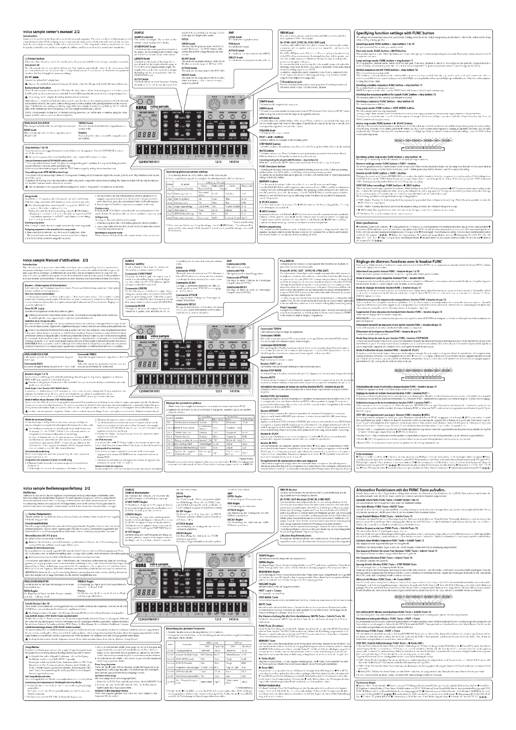 Drüen Sie die -Taste (REC), nadem Sie die Einstellungen festgelegt haben. Die Einstellungen werden gespeiert und der volca sample wird neugestartet. Drüen Sie die -Taste (PLAY), wenn Sie die Veränderung der Einstellungen abbreen wollen. Technische Daten Tastatur: Multi-Tou Controller Klangerzeugung: PCM-Klangquellen (maximal 8 Noten gleizeitig), digitaler Hall, analoger Isolator Anslüsse: (Kopörerbuse)-Buse (ø3,5 mm Stereo-Miniklinkenbuse), SYNC IN-Buse (ø3,5 mm Mono-Miniklinkenbuse; maximaler Eingangspegel: 20 V), SYNC OUT-Buse (ø3,5 mm Mono-Miniklinkenbuse; Ausgangpegel: 5 V) Stromversorgung: 6 Alkali-Baerien (AA/LR6) oder 6 NiMH-Baerien (AA), optionales AC-Netzteil (DC 9 V ) Baerielaufzeit: Ca. 10 Stunden (bei Verwendung von Alkali-Baerien) Abmessungen (B x T x H): 193×115×45 mm Gewit: 372 g (ohne Baerien) Lieferumfang: 6 Alkali-Baerien, Kabel, Bedienungsanleitung Optional: AC-Netzteil (DC 9 V ) Song-Modus Zusätzli zu 10 Sequenzen kann der volca sample 6 Songs wiedergeben. Jeder Song kann mit bis zu 16 Sequenzen in beliebiger Reihenfolge erstellt werden. Im Song-Modus stehen folgende Funktionen nit zur Verfügung. Im Display wird in diesem Fall „SONG“ angezeigt. Wiedergabe miels der Sri-Tasten, Aufnahme miels der REC-Taste, Einstellen von Part-Parametern mit den Reglern, dur Drüen der FUNC + Sri-Tasten aufgerufene Funktionen, Bedienung der PART < und >-Tasten, Stummsaltungs-Einstellungen, Rüwärtswiedergabe-Einstellungen, Hall ein/ausDen Song-Modus aufrufenWenn ein Song geladen wird, fährt der volca sample automatis in den Song-Modus.Zuweisung von Sequenzen zur Wiedergabe im Song-Modus Drüen Sie eine der Sri-Tasten 1 bis 16, um die Wiedergabereihenfolge auszuwählen.Im Display werden die Wiedergabereihenfolge und die Nummer der Sequenz angezeigt.2. Wählen Sie mit dem SAMPLE-Wahlsalter die Sequenz aus. Die LEDs unterhalb der Sri-Tasten zeigen an, ob die Wiedergabe der zugewiesenen Sequenz aktiviert oder deaktiviert ist. Wenn der volca sample in den Aktivsri-Modus gefahren ist, drüen Sie die Sri-Tasten, um die entspreende Sequenz zu aktivieren oder deaktivieren. Wiederholen Sie die Srie 1 bis 3, bis Sie die gewünsten Sequenzen Ihrem Song zugewiesen haben.Einen Song abspielenWenn Sie die -Taste (PLAY) drüen, werden die Sequenzen in der vorgegebenen Reihenfolge abgespielt. Die Reihenfolge der Wiedergabe kann au im Sprung-Sri-Modus festgelegt werden.Speichern eines SongsDer volca sample kann ses Songs speiern. Halten Sie die FUNC-Taste gedrüt und drüen Sie die MEMORY-Taste. Drüen Sie eine der Sri-Tasten 11 (S11) bis 16 (S6), um den Speierplatz des Songs auszuwählen.Rückkehr in den Sequenzer-ModusWenn eine Sequenz geladen wird, kehrt der volca sample in den Sequenzer-Modus zurü. volca sample Manuel d’utilisation 2/2 Introduction Merci d’avoir choisi le séquenceur à échantillon numérique volca sample de Korg. Le volca sample est un séquenceur rythmique doté d’une source sonore numérique. Il conserve les modes d’activation de pas et de saut de pas très appréciés par les utilisateurs du vocal beats, tout en incorporant un mode Song avec une série de fonctions peaunées ainsi qu’un éventail de fonctions de lecture spéciales pour la lecture partielle et la lecture inversée des échantillons. Vous pouvez en outre transférer des échantillons tout frais d’un iPhone. Bouton (Interrupteur d’alimentation) Cet interrupteur met l’instrument sous/hors tension. Pour couper l’alimentation, maintenez l’interrupteur enfoncé pendant environ une seconde.Mise hors tension automatiqueLe volca sample comporte une fonction de coupure d’alimentation automatique. L’alimentation du volca sample est automatiquement coupée si l’instrument ne produit aucun son durant environ 4 heures. Vous pouvez désactiver cee fonction de coupure automatique d’alimentation. (Voyez la section “Réglage des paramètres globaux”.) Prise DC 9V Branchez ici l’adaptateur secteur disponible en option. Utilisez exclusivement l’adaptateur secteur spécié. Si vous utilisez un adaptateur secteur autre que le modèle spécié, vous risquez de provoquer des dysfonctionnements.Indication de la charge des piles Quand vous meez le volca sample sous tension, les témoins en dessous des boutons de pas indiquent l’état de charge des piles. Si tous les témoins s’allument, les piles sont complètement chargées. Moins il y a de témoins allumés, plus les piles sont usées. Quand vous alimentez l’instrument avec son adaptateur secteur, l’indication de niveau des piles est désactivée. Vous pouvez utiliser des piles alcalines ou au nickel-hydrure métallique. Pour que l’instrument puisse détecter et acher correctement le niveau de charge des piles, vous devez au préalable dénir le type de piles en place avec les paramètres globaux du volca sample. Si, au cours d’une session, la charge des piles diminue dangereusement, le volca sample vous avertit en achant le message clignotant “bt.Lo” sur son écran. Quand les piles sont plates, le volca sample se met automatiquement hors tension. REMARQUE: Il est impossible d’arrêter l’achage de l’avertissement de charge basse des piles mais vous pouvez continuer à utiliser le volca sample jusqu’à épuisement complet.until the baeries have run down completely. ANALOGUE ISOLATOR Cee section permet de changer le niveau du grave et de l’aigu. Commande BASS Elle permet de régler le niveau du grave entre –∞ dB et +6 dB. Commande TREBLE Elle permet de régler le niveau de l’aigu entre –∞ dB et +6 dB. Écran Ache les valeurs des paramètres dénies avec les commandes et boutons de l’instrument. SAMPLE Sélecteur SAMPLE Il sert à choisir l’échantillon. Le numéro de l’échantillon sélectionné s’ache à l’écran. Commande START POINT Elle permet de dénir le point de départ pour la lecture d’un échantillon. Réglez le point de départ sur toute valeur entre 0% et 90% (pourcentage de 