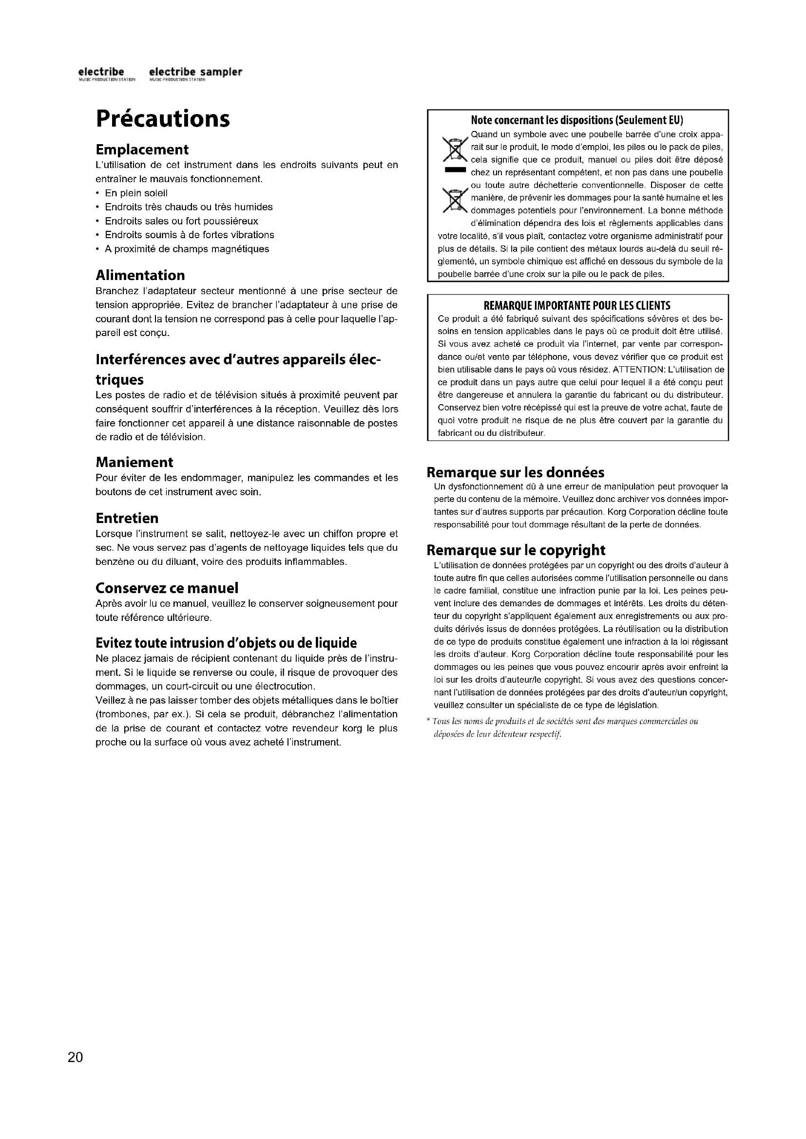 - A proximité de champs magnétiques Alimentation Branchez l’adaptateur secteur mentionné à une prise secteur de tension appropriée. Evitez de brancher l’adaptateur à une prise de courant dont la tension ne correspond pas à celle pour laquelle l’ap- pareil est conçu. Interférences avec d’autres appareils élec- triques Les postes de radio et de télévision situés à proximité peuvent par conséquent souffrir d’interférences à la réception. Veuillez dès lors faire fonctionner cet appareil à une distance raisonnable de postes de radio et de télévision. Maniement Pour éviter de les endommager, manipulez les commandes et les boutons de cet instrument avec soin. Entretien Lorsque l’instrument se salit, nettoyez-le avec un chiffon propre et sec. Ne vous servez pas d’agents de nettoyage liquides tels que du benzène ou du diluant, voire des produits inflammables. Conservez ce manuel Après avoir lu ce manuel, veuillez le conserver soigneusement pour toute référence ultérieure. Evitez toute intrusion d’objets ou de liquide Ne placez jamais de récipient contenant du liquide près de l’instru- ment. Si le liquide se renverse ou coule, il risque de provoquer des dommages, un court-circuit ou une électrocution. Veillez à ne pas laisser tomber des objets métalliques dans le boîtier (trombones, par ex.). Si cela se produit, débranchez l’alimentation de la prise de courant et contactez votre revendeur korg le plus proche ou la surface où vous avez acheté l’instrument. Note concernant les dispositions (Seulement EU) Quand un symbole avec une poubelle barrée d’une croix appa-rait sur le produit, le mode d’emploi, les piles ou le pack de piles, cela signifie que ce produit, manuel ou piles doit être déposé chez un représentant compétent, et non pas dans une poubelle ou toute autre déchetterie conventionnelle. Disposer de cette manière, de prévenir les dommages pour la santé humaine et les dommages potentiels pour l’environnement. La bonne méthode d’élimination dépendra des lois et règlements applicables dans votre localité, s’il vous plaît, contactez votre organisme administratif pour plus de détails. Si la pile contient des métaux lourds au-delà du seuil ré-glementé, un symbole chimique est affiché en dessous du symbole de la poubelle barrée d’une croix sur la pile ou le pack de piles.