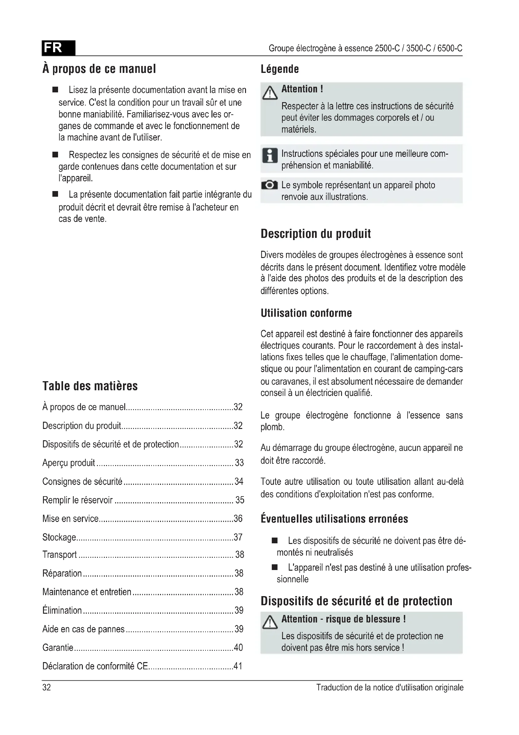 - Groupe électrogène à essence 2500-C / 3500-C / 6500-C Table des matières À propos de ce manuel p. 32