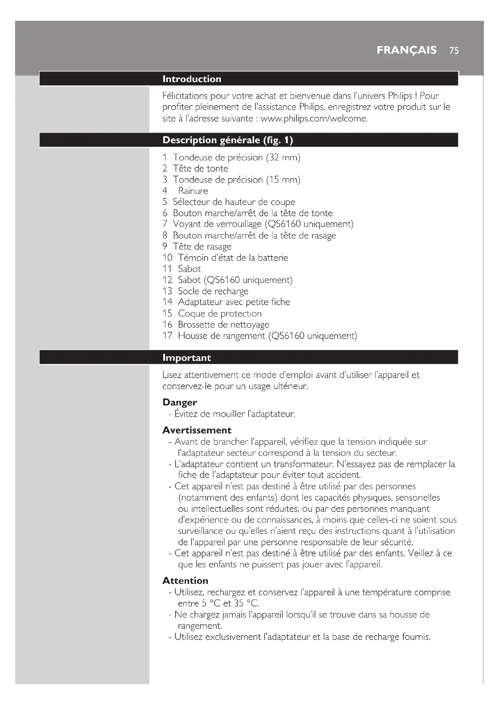 FRANÇAIS 791 Tirez sur le sabot pour le détacher de l’appareil. Ne tirez jamais sur la partie supérieure exible du sabot. Tirez toujours sur la partie inférieure. 2 Appuyez sur le bouton marche/arrêt de la tête de tonte pour la mettre en marche. 3 Tenez l’appareil avec la tête de tonte orientée vers le haut et passez la partie large de la tête de tonte en effectuant des mouvements descendants. Utilisation de la tondeuse de précision La tondeuse de précision est deux fois moins large que la partie large de la tête de tonte. Elle offre donc plus de précision pour tondre le tour des oreilles, les favoris et autour de la bouche et sous le nez. 1 Pour utiliser la tondeuse de précision, tournez le bloc tondeuse de manière à ce que la tondeuse de précision soit orientée vers l’avant de l’appareil. 2 Appuyez sur le bouton marche/arrêt de la tête de tonte pour la mettre en marche. 3 Tenez l’appareil avec la tête de tonte orientée vers le haut et passez la tondeuse de précision en effectuant des mouvements descendants. Rasage Avant d’utiliser la tête de rasage, vériez toujours qu’elle n’est pas endommagée ou usée. Si la tête de rasage est endommagée ou usée, ne l’utilisez pas : vous risqueriez de vous blesser. Remplacez d’abord la tête de rasage endommagée (voir le chapitre « Remplacement »). FRANÇAIS801 Tenez l’appareil en position de rasage, la tête de rasage orientée vers le haut et la tête de tonte vers le bas. 2 Appuyez sur le bouton marche/arrêt de la tête de rasage pour la mettre en marche. , QS6160 uniquement : le bouton marche/arrêt s’allume pour indiquer que la tête de rasage fonctionne. 3 Placez la tête de rasage sur la peau et déplacez l’appareil dans le sens inverse de la pousse des poils tout en exerçant une faible pression. Conseil - Veillez à ce que la tête de rasage soit toujours en contact avec la peau. - Vous pouvez allumer la tête de rasage lorsque la tête de tonte fonctionne. Dans un tel cas, la tête de tonte s’éteint immédiatement. 4 Après utilisation, appuyez à nouveau sur le bouton marche/arrêt de la tête de rasage pour l’éteindre. Protection anti-surcharge Si vous appuyez la tête de tonte ou la tête de rasage trop fortement sur votre peau ou si son bloc tondeuse se bloque (par ex., par des vêtements, etc.), le bouton marche/arrêt de la tête de tonte ou la tête de rasage bloquée clignote rapidement (QS6160 uniquement) et l’appareil s’éteint automatiquement. Retirez l’élément responsable du blocage avant de réutiliser l’appareil. FRANÇAIS 81Nettoyage et entretien Nettoyez l’appareil après chaque utilisation. N’utilisez jamais d’air comprimé, de tampons à récurer, de produits abrasifs ou de détergents agressifs tels que de l’essence ou de l’acétone pour nettoyer l’appareil. Nettoyez l’appareil et l’adaptateur uniquement à l’aide de la brosse de nettoyage fournie. Remarque : La tête de tonte et la tête de rasage n’ont pas besoin d’être lubriées. Nettoyage de la tête de tonte 1 Éteignez l’appareil. 2 Retirez le sabot de la tête de tonte. 3 Nettoyez la tête de tonte sous le robinet. Nettoyage du connecteur de la tête de tonte Remarque : Veillez à nettoyer le connecteur de la tête de tonte au moins une fois tous les trois mois. 1 Éteignez l’appareil. 2 Retirez doucement la tête de tonte de l’appareil. 3 Enlevez les poils à l’intérieur du connecteur de la tête de tonte à l’aide de la brossette de nettoyage. FRANÇAIS824 Nettoyez l’intérieur de la tête de tonte à l’aide de la brossette de nettoyage. 5 Une fois le nettoyage terminé, replacez la tête de tonte sur l’appareil. Nettoyage de la tête de rasage 1 Éteignez l’appareil. 2 Retirez la tête de rasage de l’appareil. Remarque : La tête de rasage est très fragile. Manipulez-la avec précaution. Remplacez-la si elle est endommagée. 3 Rincez la tête de rasage à l’eau tiède. Ne nettoyez pas la tête de rasage avec la brossette de nettoyage pour éviter tout dommage. FRANÇAIS 834 Retirez les poils des lames à l’aide de la brossette de nettoyage. 5 Une fois le nettoyage terminé, replacez la tête de rasage sur l’appareil (clic). Remplacement En cas d’utilisation fréquente, remplacez la grille de rasage et les lames tous les ans. Grille 1 Retirez la tête de rasage de l’appareil. 2 Retirez l’ancienne grille de rasage de la tête de rasage. 3 Placez la nouvelle grille de rasage sur la tête de rasage (clic). Lames 1 Retirez la tête de rasage de l’appareil. 2 Enlevez les lames. 3 Fixez les nouvelles lames sur l’appareil (clic). Rangement Vous pouvez plier le chargeur pour faciliter le transport ou le rangement. 1 Pour plier le chargeur : rabattez la base du chargeur contre le support de l’appareil. FRANÇAIS842 Placez le capot de protection sur l’unité de rasage. Verrouillage (QS6160 uniquement) L’appareil est équipé d’un verrouillage intégré qui évite que l’appareil ne s’allume intempestivement pendant le transport. 1 Pour activer le verrouillage, maintenez enfoncé(s) le bouton marche/ arrêt de la tête de tonte, le bouton marche/arrêt de la tête de rasage ou ces deux boutons pendant au moins 4 secondes tandis que le voyant de verrouillage clignote 3 fois. , Le verrouillage est activé uniquement lorsque le voyant s’allume de manière continue. 2 Pour désactiver le verrouillage, maintenez enfoncé(s) le bouton marche/arrêt de la tête de tonte, le bouton marche/arrêt de la tête de rasage ou ces deux boutons pendant au moins 4 secondes tandis que le voyant de verrouillage clignote 3 fois. , Le verrouillage est maintenant désactivé et l’appareil s’allume. Remarque : Le verrouillage peut également être désactivé par la mise en charge de l’appareil. Commande d’accessoires Pour acheter des accessoires pour cet appareil, rendez-vous sur notre boutique en ligne à l’adresse www.shop.philips.com/ser