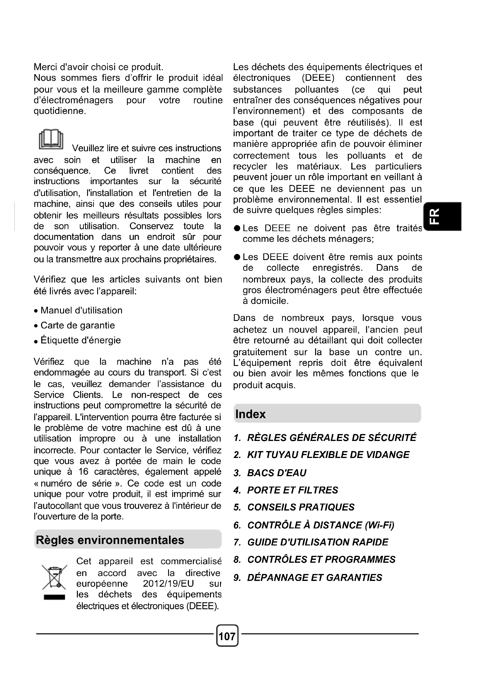 Cette machine est conçue uniquement pour usage domestique à savoir pour sécher le linge domestique et les vêtements. Vérifiez que vous avez bien compris les instructions d’installation et d’utilisation avant de mettre en marche l’appareil.