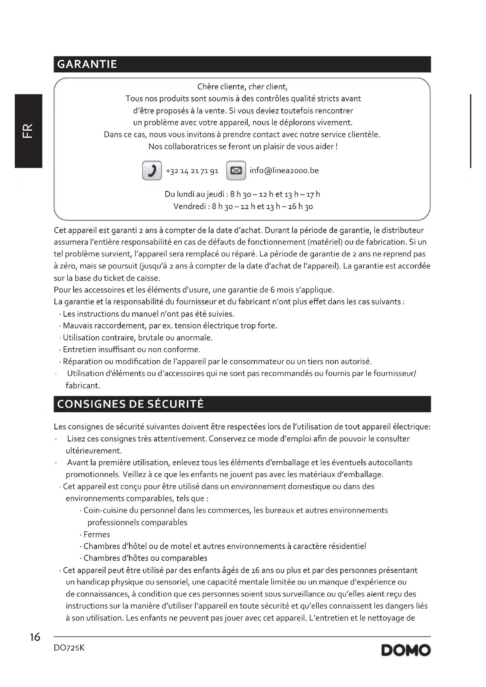 GARANTIE Chère cliente, cher client, Tous nos produits sont soumis à des contrôles qualité stricts avant d’être proposés à la vente. Si vous deviez toutefois rencontrer un problème avec votre appareil, nous le déplorons vivement. Dans ce cas, nous vous invitons à prendre contact avec notre service clientèle. Nos collaboratrices se feront un plaisir de vous aider ! +32 14 21 71 91 info@linea2000.be Du lundi au jeudi : 8 h 30 – 12 h et 13 h – 17 h Vendredi : 8 h 30 – 12 h et 13 h – 16 h 30 Cet appareil est garanti 2 ans à compter de la date d’achat. Durant la période de garantie, le distributeur assumera l’entière responsabilité en cas de défauts de fonctionnement (matériel) ou de fabrication. Si un tel problème survient, l’appareil sera remplacé ou réparé. La période de garantie de 2 ans ne reprend pas à zéro, mais se poursuit (jusqu’à 2 ans à compter de la date d’achat de l’appareil). La garantie est accordée sur la base du ticket de caisse. Pour les accessoires et les éléments d’usure, une garantie de 6 mois s’applique. La garantie et la responsabilité du fournisseur et du fabricant n’ont plus eet dans les cas suivants :