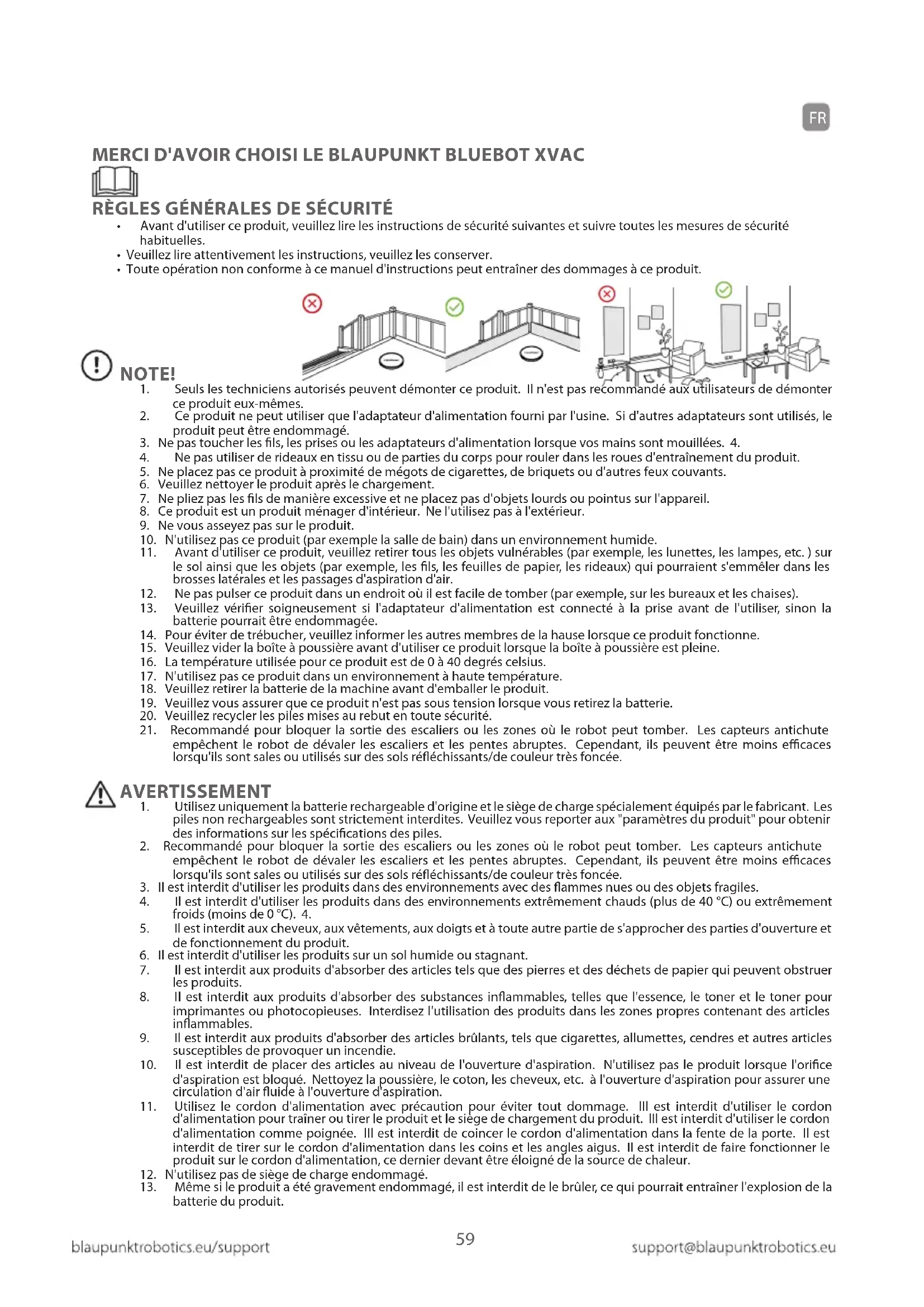 - Si le robot n'est pas utilisé pendant une longue période, il doit être entièrement chargé puis placé dans un endroit frais et sec. Chargez le robot au moins tous les trois mois pour éviter d'endommager les batteries en raison d'une décharge excessive. LIMITES D'UTILISATION FR72 GARANTIE Ce produit est garanti 2 ans contre les défauts de fabrication. La période de garantie est calculée à partir de la date d'achat du produit, selon la facture d'achat. La garantie du produit ne couvre que les défauts de fabrication, les défauts résultant d'une utilisation incorrecte, telle qu'une chute, un transport inadéquat, un raccordement au réseau électrique non conforme à la tension spéciée dans ce manuel, l'insertion de corps étrangers et l'usure naturelle des pièces et des parties telles que les pièces en plastique (bouchons, boutons, poignées, verrous, câbles d'alimentation, etc. ) et les pièces métalliques (ls, moteurs, etc. ). Ne sont pas non plus couverts les dommages dus aux agents de la nature (foudre, aliments, mer, oxydation, humidité, etc. ). Le produit perdra sa garantie s'il présente des défauts qui, après analyse par nos techniciens, sont caractérisés par une utilisation inadéquate, une utilisation professionnelle ou un usage auquel il n'est pas destiné (selon le manuel d'utilisation). Cette garantie sera annulée s'il s'avère que l'appareil a été altéré, a été réparé par une personne ou un service non autorisé par Blaupunkt. La garantie n'est valable qu'avec le reçu/facture fourni lors de l'achat. Blaupunkt s'engage à fournir les services susmentionnés pendant la période de garantie uniquement dans les lieux où il dispose d'un service agréé. Les consommateurs qui ne se trouvent pas à proximité d'un centre de service agréé doivent assumer les coûts et les risques du transport vers le service agréé de leur choix. L'usure naturelle n'est pas couverte par la garantie. Ce produit est destiné à un usage domestique uniquement.