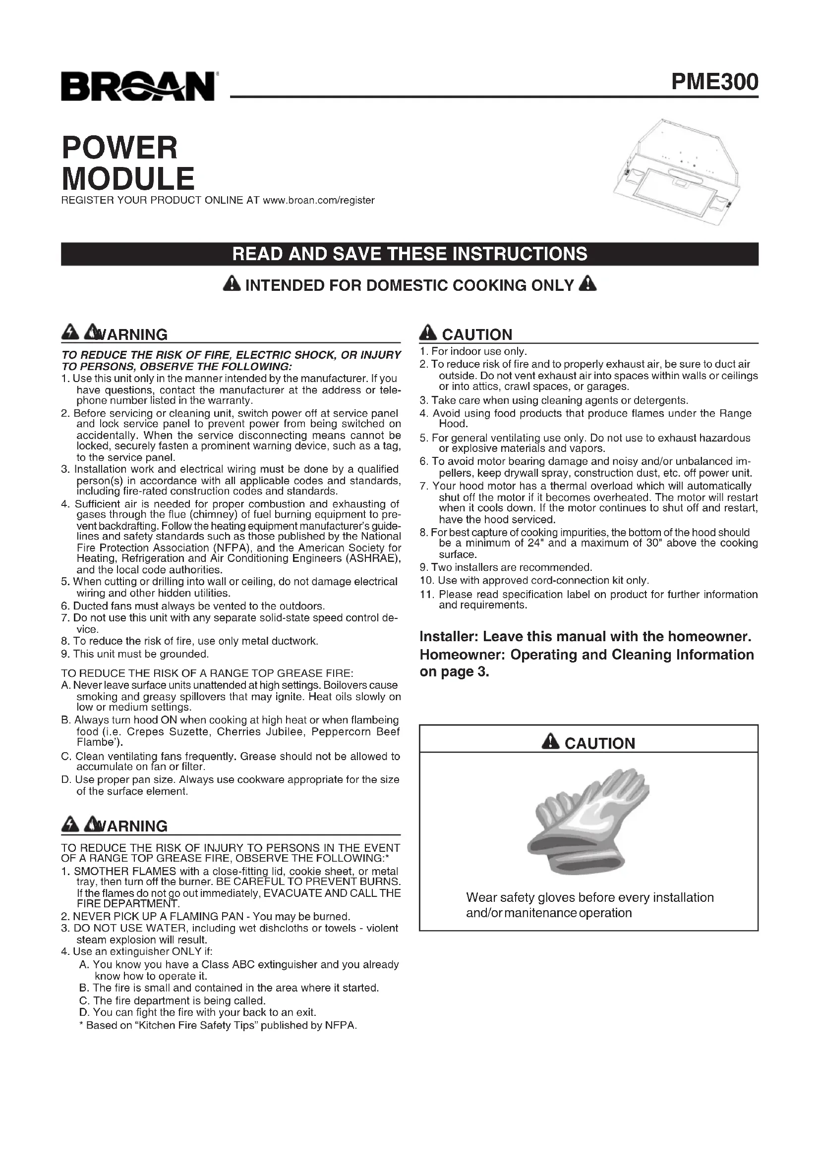 PME300 - Hotte BROAN - Notice d'utilisation et mode d'emploi gratuit