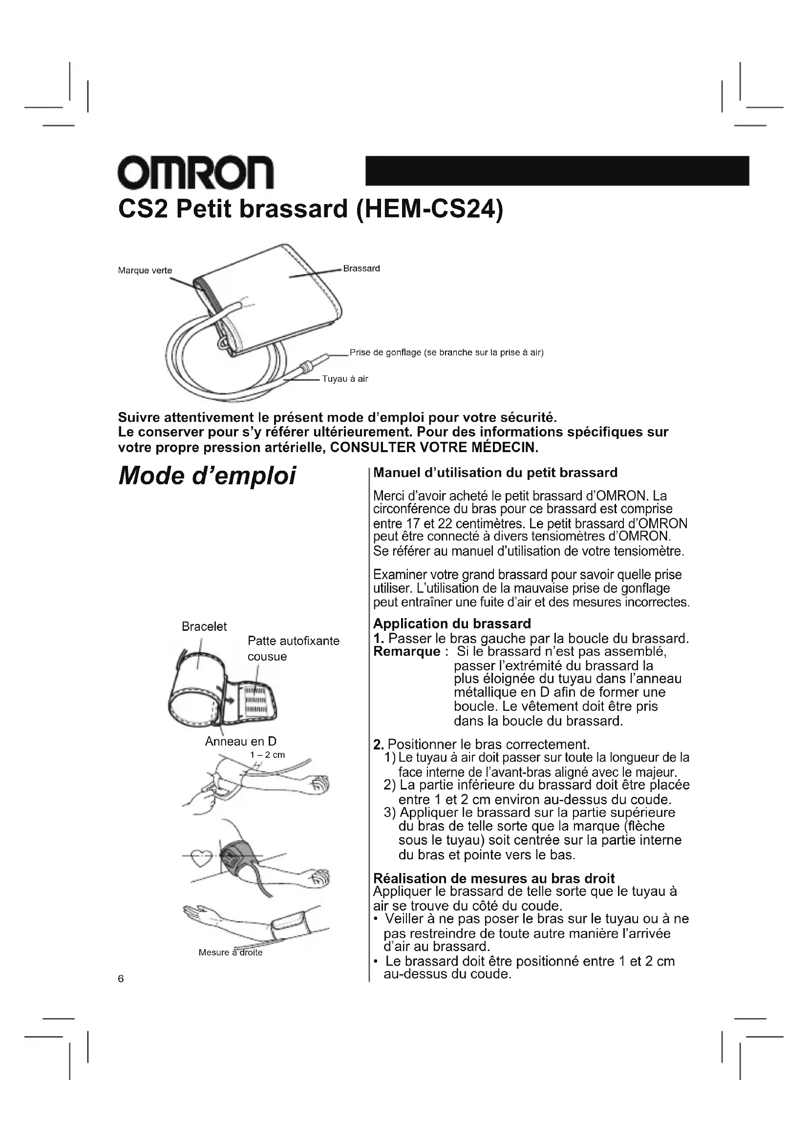 - Le brassard doit être positionné entre 1 et 2 cm au-dessus du coude. Suivre attentivement le présent mode d’emploi pour votre sécurité. Le conserver pour s’y référer ultérieurement. Pour des informations spéciques sur votre propre pression artérielle, CONSULTER VOTRE MÉDECIN. CS2 Petit brassard (HEM-CS24) Marque verteBrassardPrise de gonage (se branche sur la prise à air)Tuyau à air Pile side material Sewn hook material D-ring 1 – 2 cm Mesure à droiteBraceletPatte autoxante cousueAnneau en D1 – 2 cm7
