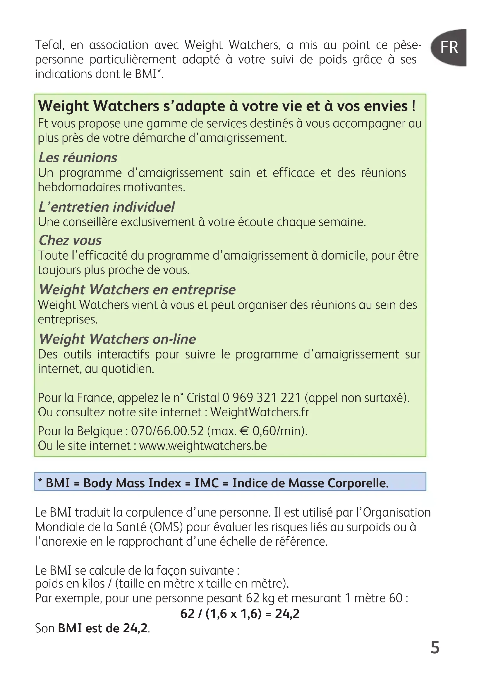 Tefal, en association avec Weight Watchers, a mis au point ce pèse- personne particulièrement adapté à votre suivi de poids grâce à ses indications dont le BMI*. Weight Watchers s’adapte à votre vie et à vos envies ! Et vous propose une gamme de services destinés à vous accompagner au plus près de votre démarche d’amaigrissement. Les réunions Un programme d’amaigrissement sain et efficace et des réunions hebdomadaires motivantes. L’entretien individuel Une conseillère exclusivement à votre écoute chaque semaine. Chez vous Toute l’efficacité du programme d’amaigrissement à domicile, pour être toujours plus proche de vous. Weight Watchers en entreprise Weight Watchers vient à vous et peut organiser des réunions au sein des entreprises. Weight Watchers on-line Des outils interactifs pour suivre le programme d’amaigrissement sur internet, au quotidien. Pour la France, appelez le n° Cristal 0 969 321 221 (appel non surtaxé). Ou consultez notre site internet : WeightWatchers.fr Pour la Belgique : 070/66.00.52 (max. € 0,60/min). Ou le site internet : www.weightwatchers.be