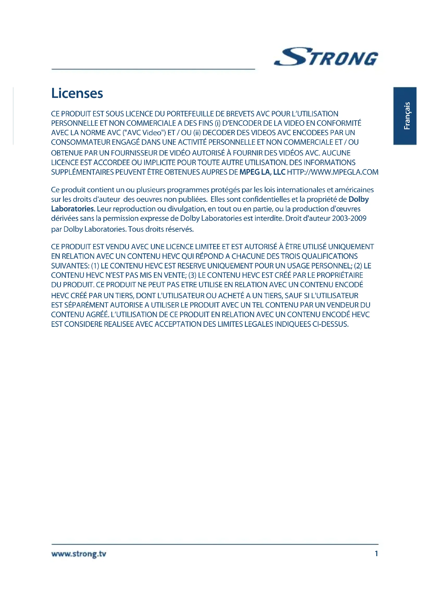 STRONG déclare que ce point SRT 8213 est conforme aux exigences de base et aux autres dispositions et directives applicables EMC 2014/30/EU, LVD 2014/35/EU et RoHS 2011/65/EU. En raison de nos recherches et développement permanents, les caractéristiques techniques, lignes et apparences des produits sont susceptibles d’êtres modifiés à tout moment. HDMI, le logo HDMI et « High-Definition Multimedia Interface » sont des marques ou des marques enregistrées appartenant à HDMI Licensing LLC aux Etats Unis et dans les autres pays. Fabriqué sous licence de Dolby Laboratories. Dolby et le symbole double-D sont des marques enregistrées du laboratoire Dolby. Tous noms de produits et logos sont des marques ou marques enregistrées de leurs propriétaires respectifs. © STRONG 2021. Tous droits réservés. 2Français