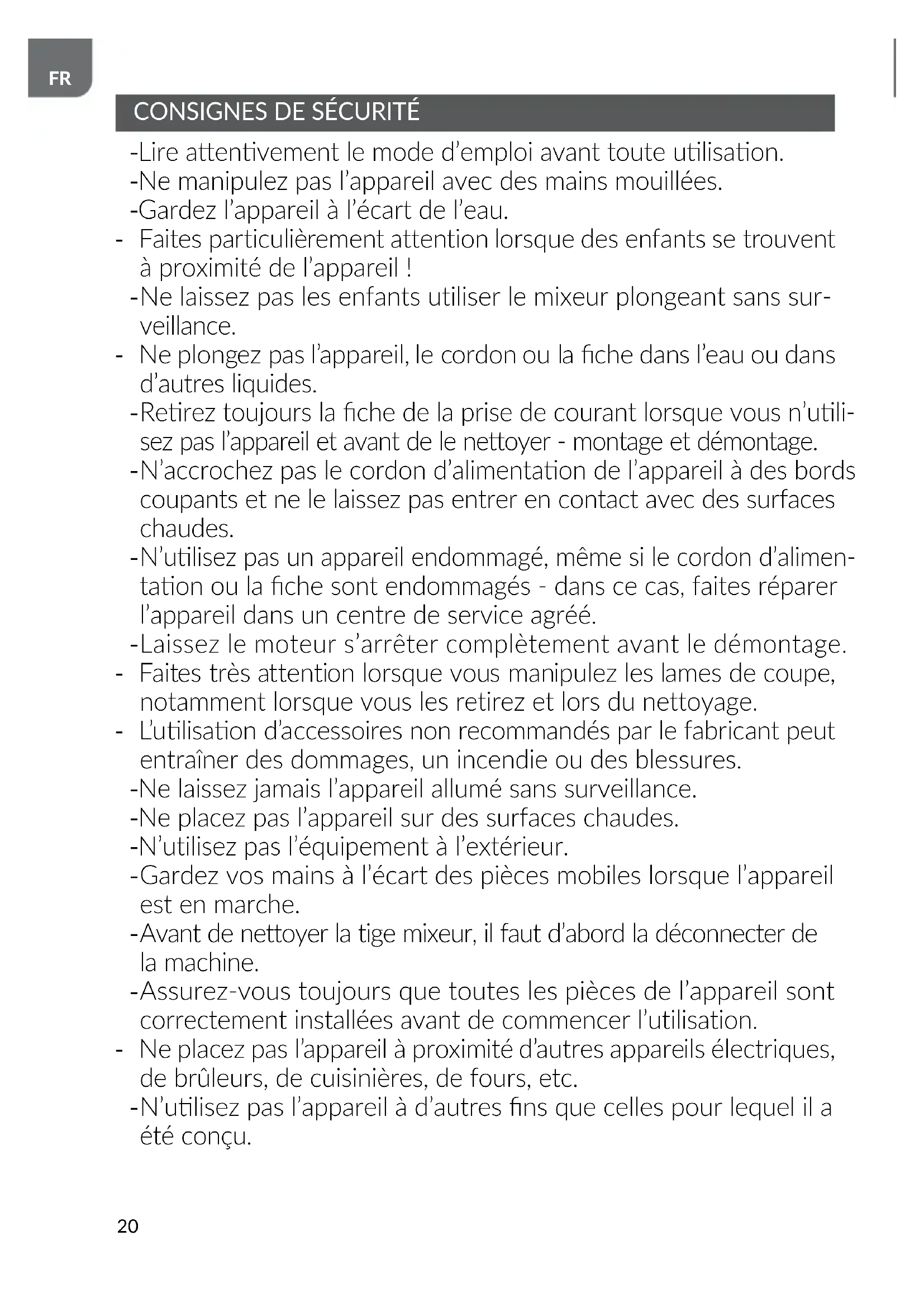 Ne laissez pas les enfants utiliser le mixeur plongeant sans sur- veillance. - Ne plongez pas l’appareil, le cordon ou la che dans l’eau ou dans d’autres liquides.