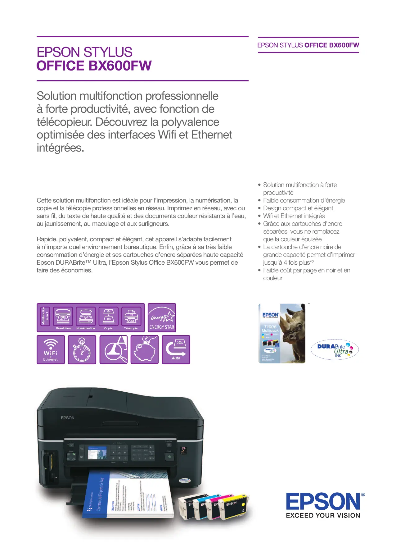 Solution multifonction professionnelle à forte productivité, avec fonction de télécopieur. Découvrez la polyvalence optimisée des interfaces Wifi et Ethernet intégrées. Cette solution multifonction est idéale pour l’impression, la numérisation, la copie et la télécopie professionnelles en réseau. Imprimez en réseau, avec ou sans fil, du texte de haute qualité et des documents couleur résistants à l’eau, au jaunissement, au maculage et aux surligneurs. Rapide, polyvalent, compact et élégant, cet appareil s’adapte facilement à n’importe quel environnement bureautique. Enfin, grâce à sa très faible consommation d’énergie et ses cartouches d’encre séparées haute capacité Epson DURABrite™ Ultra, l’Epson Stylus Office BX600FW vous permet de faire des économies.